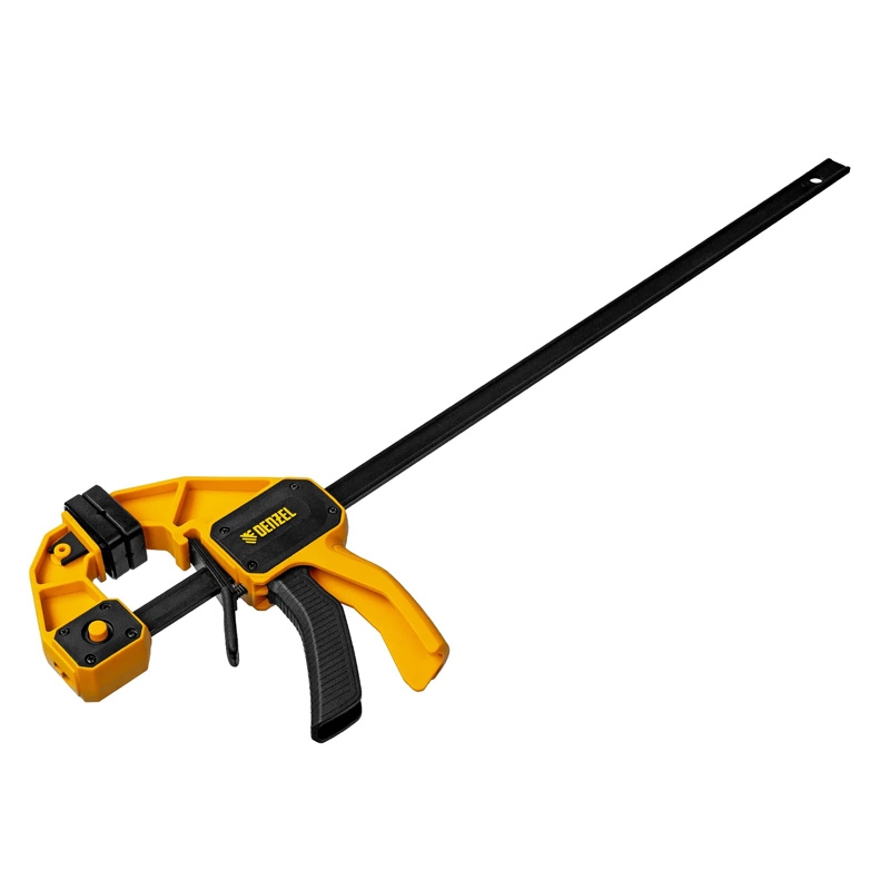 Струбцина весит всего 710 г, а обрезиненная кнопка фиксации обеспечивает удобный захват, что делает её комфортной в использовании. Инструмент подходит как для бытовых, так и для профессиональных задач.