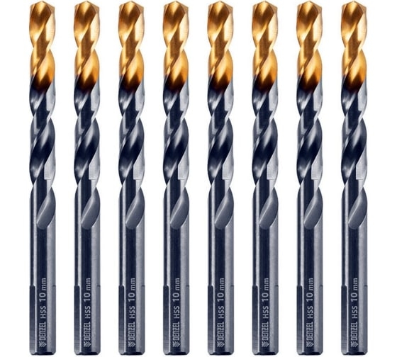 Сверло по металлу Golden Tip 10 мм, HSS-Tin, 8 шт, DIN 338 Denzel 717222 предназначено для сверления сквозных и глухих отверстий в легированной и нелегированной стали, железе, чугуне, листовом и цветном металлах, пластмассе.