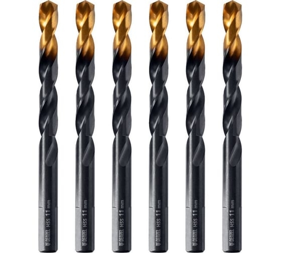 Сверло по металлу Golden Tip 11 мм, HSS-Tin, 6 шт, DIN 338 Denzel 717223 предназначено для сверления сквозных и глухих отверстий в легированной и нелегированной стали, железе, чугуне, листовом и цветном металлах, пластмассе.