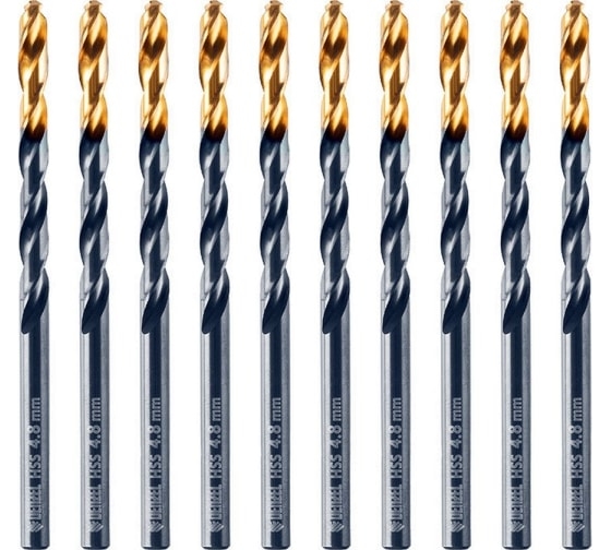 Сверло по металлу Denzel Golden Tip из стали HSS-TiN, 10 шт. в упаковке, используется для получения отверстий в стальных заготовках. Оснастка вышлифована на современном оборудовании и имеет класс точности A1, что позволяет получить отверстия высокого качества. Набор применяется во время слесарных работ. Прочность — сверла из быстрорежущей стали устойчивы к перегреву и выдерживают высокие нагрузки.
