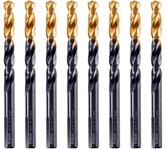 Сверло по металлу Golden Tip 8.5 мм, HSS-Tin, 8 шт, DIN 338 Denzel 717220 предназначено для сверления сквозных и глухих отверстий в легированной и нелегированной стали, железе, чугуне, листовом и цветном металлах, пластмассе.
