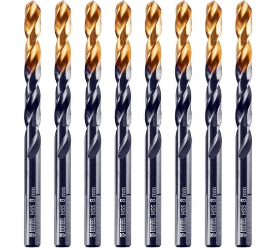 Сверло по металлу Golden Tip 8 мм, HSS-Tin, 8 шт, DIN 338 Denzel 717219 предназначено для сверления сквозных и глухих отверстий в легированной и нелегированной стали, железе, чугуне, листовом и цветном металлах, пластмассе.