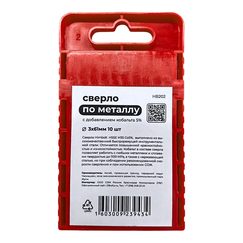 Сверло по металлу с кобальтом 5% P6M5K5 3,0 мм HIMBOLT 10 шт.пластиковый бокс