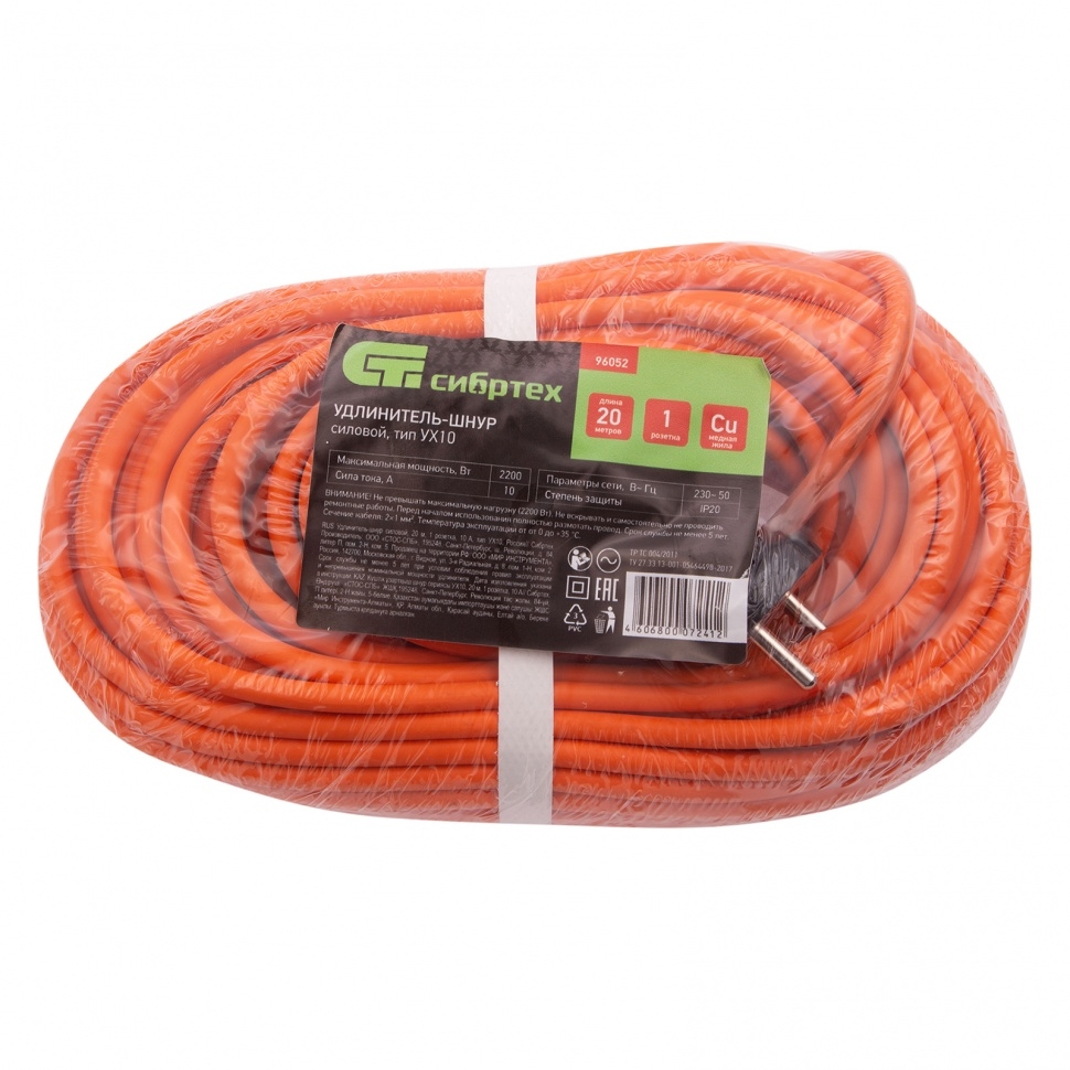 Удлинитель-шнур силовой, 20 м, 10А, 1 розетка, тип УХ10 Сибртех