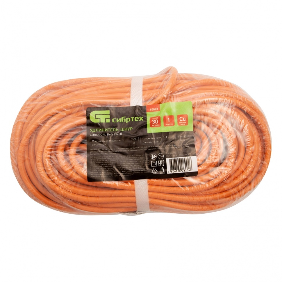 Удлинитель-шнур силовой, б/з, ПВС, 30 м, 3500 Вт, (16А), 1 розетка, тип УХ16 Сибртех