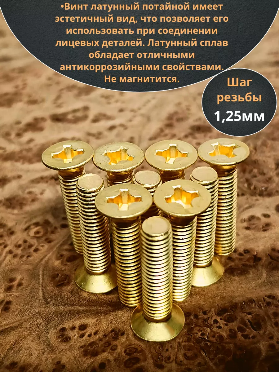 Винт с потайной головкой и крестообразным шлицем, латунный DIN 965 (ISO 7046) - крепежное изделие из высококачественного сплава с оптимальным сочетанием пластичности и прочности. Он имеет полную стандартную метрическую резьбу от М1,6 до М10, его длина (измеряется с головкой) находится в пределах 3-40 мм. Применяется для создания разъемного резьбового соединения деталей и элементов конструкций из латуни, меди, латунированной стали, пластиков, древесины. Винт потай крест из латуни обладает повышенной стойкостью к коррозии и влиянию сильноагрессивных сред. Нагрузка на разрыв составляет 300-440 Н/мм², что сопоставимо с аналогичными стальными метизами нормальной прочности. Стабильность свойств гарантирована даже при критически низких температурах. Магнитная пассивность и электрическая проводимость латуни обуславливают его применение при сборке электроники, электротехники и приборов. Винт латунный потайной крестовый подлежит установке в резьбовое отверстие базового элемента.