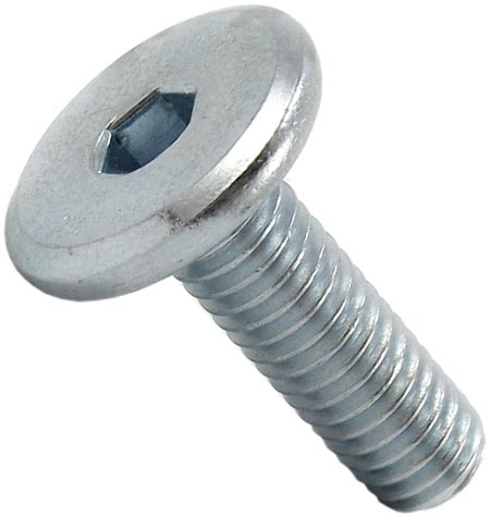 Мебельный винт плоский (оцинкованный) с шестигранным углублением предназначен для сквозного скрепления элементов корпусной и мягкой мебели, а также лестничных и других деревянных конструкций. С обратной стороны соединяемых деталей на резьбовой конец стержня накручивается гайка с шайбой, затем крепеж затягивается угловым ключом типа имбус. Эстетически привлекательное крепление создается при совместном использовании с гайкой Эриксона. Мебельный крепеж «винт – гайка» применяется там, где требуется высокая прочность соединения на растяжение и на срез, например, при сборке диванов, кроватей, школьных или офисных шкафов, столов, стульев. Для предотвращения ослабления винтовой пары может использоваться с врезной гайкой. Винт мебельный с плоской головкой не имеет острых углов, что обеспечивает безопасное пользование мебелью. Конусный подголовник и большая часть шляпки заглубляются в деревянное основание при установке. Шестигранный шлиц позволяет от руки при помощи имбусового ключа затянуть крепеж до нужного предела.