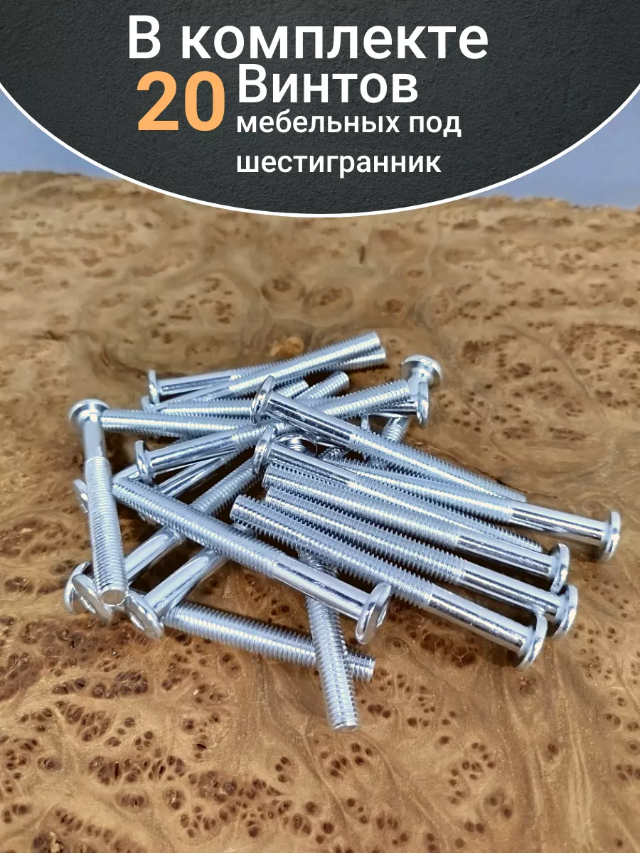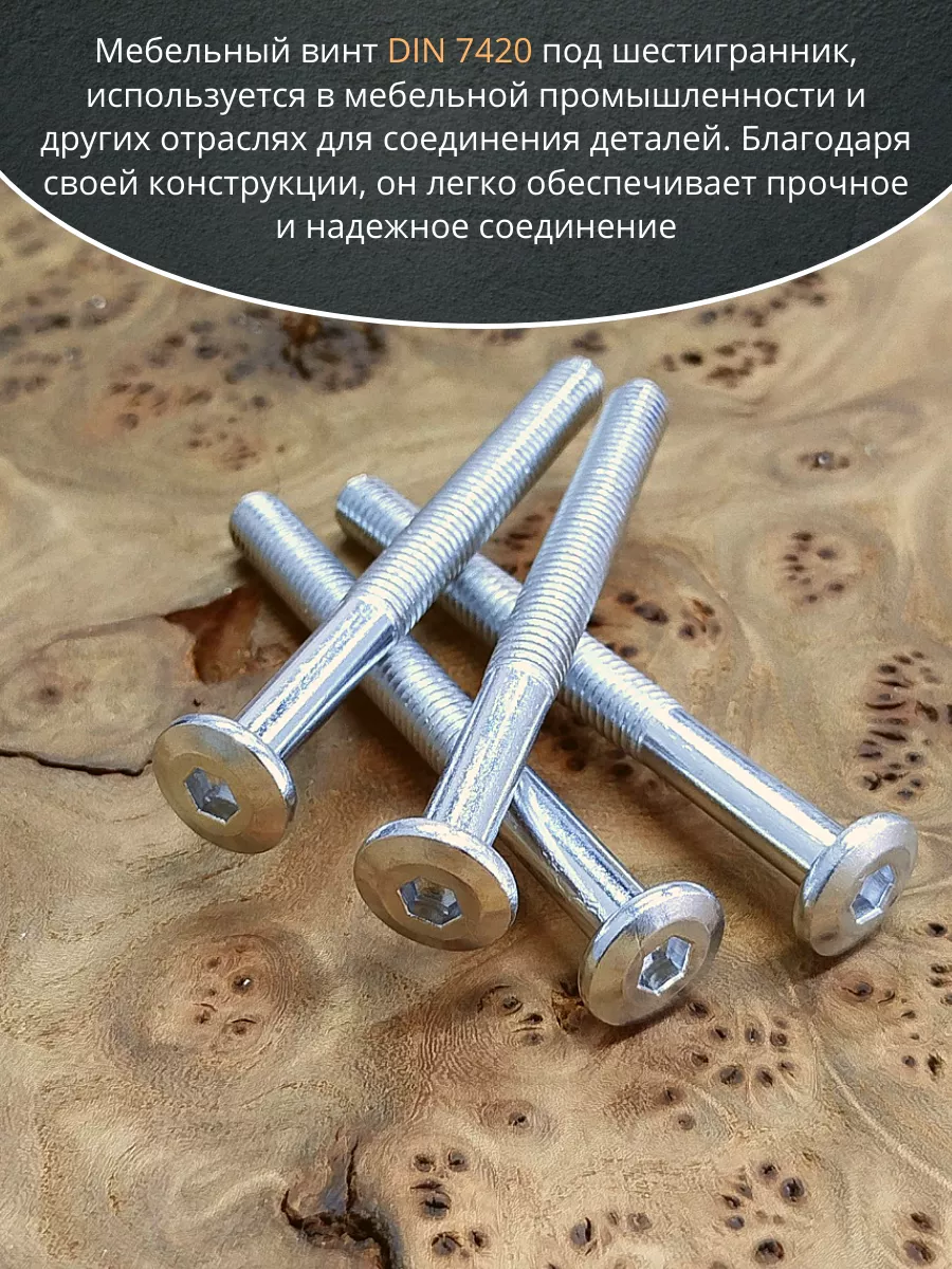 Мебельный винт плоский (оцинкованный) с шестигранным углублением предназначен для сквозного скрепления элементов корпусной и мягкой мебели, а также лестничных и других деревянных конструкций. С обратной стороны соединяемых деталей на резьбовой конец стержня накручивается гайка с шайбой, затем крепеж затягивается угловым ключом типа имбус. Эстетически привлекательное крепление создается при совместном использовании с гайкой Эриксона. Мебельный крепеж «винт – гайка» применяется там, где требуется высокая прочность соединения на растяжение и на срез, например, при сборке диванов, кроватей, школьных или офисных шкафов, столов, стульев. Для предотвращения ослабления винтовой пары может использоваться с врезной гайкой. Винт мебельный с плоской головкой не имеет острых углов, что обеспечивает безопасное пользование мебелью. Конусный подголовник и большая часть шляпки заглубляются в деревянное основание при установке. Шестигранный шлиц позволяет от руки при помощи имбусового ключа затянуть крепеж до нужного предела.