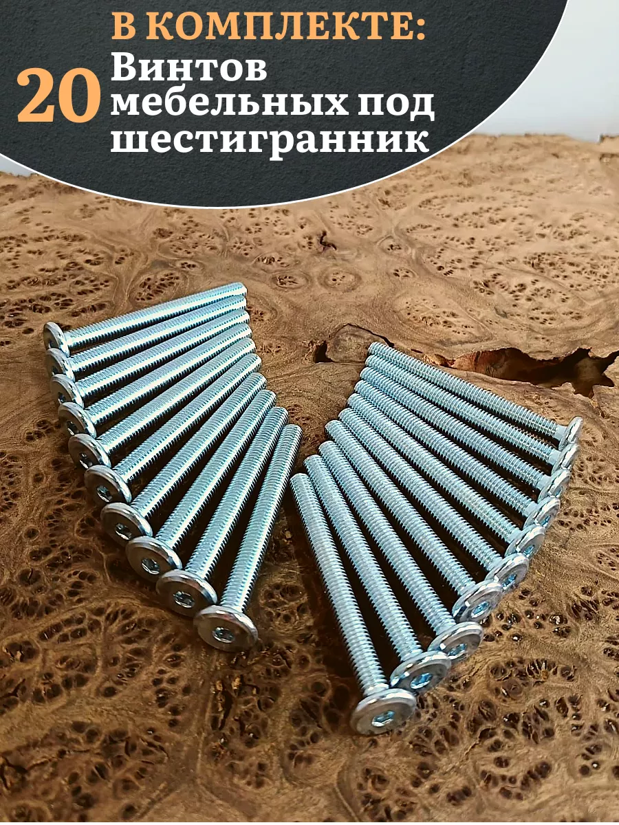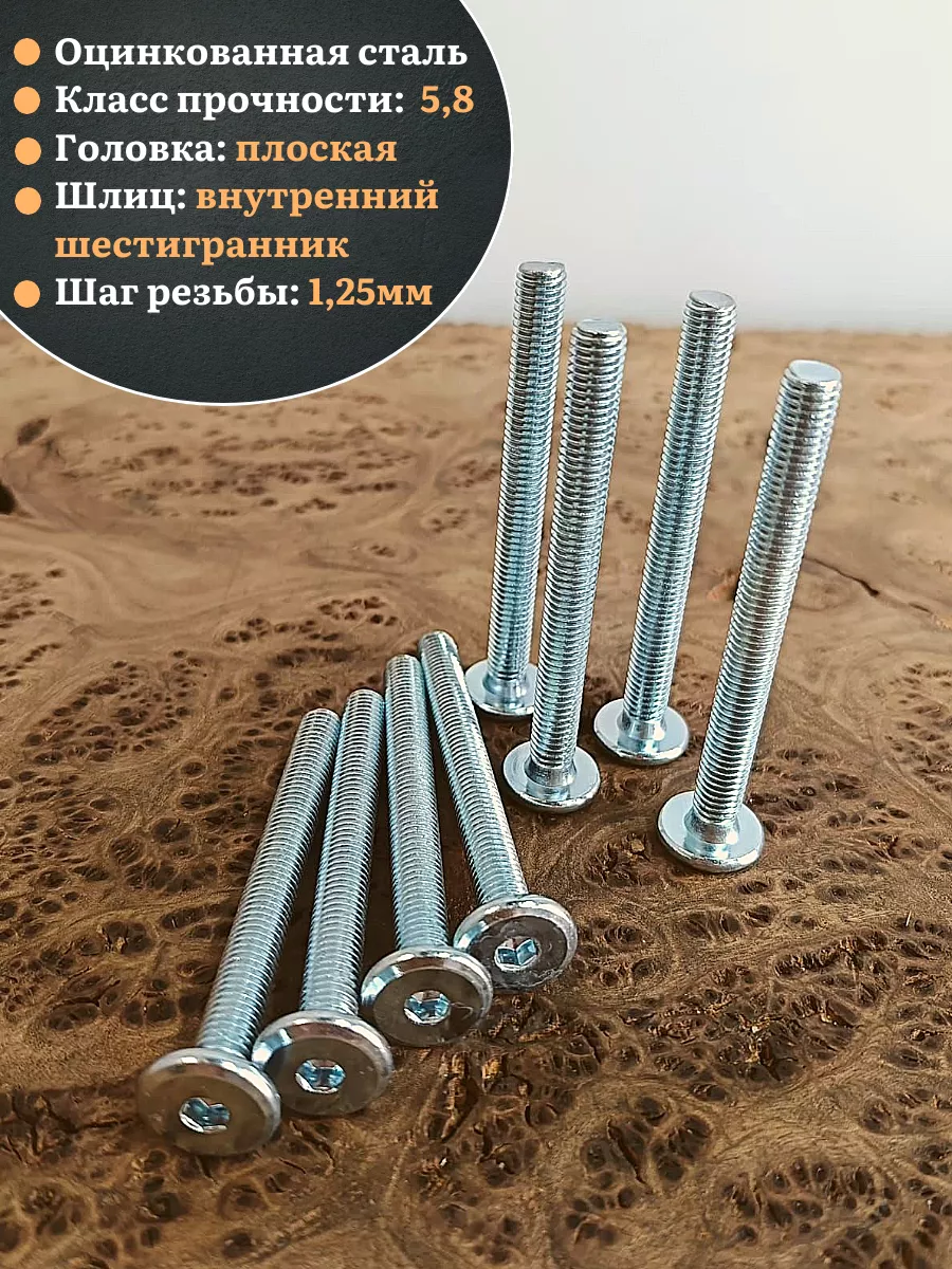 Мебельный винт плоский (оцинкованный) с шестигранным углублением предназначен для сквозного скрепления элементов корпусной и мягкой мебели, а также лестничных и других деревянных конструкций. С обратной стороны соединяемых деталей на резьбовой конец стержня накручивается гайка с шайбой, затем крепеж затягивается угловым ключом типа имбус. Эстетически привлекательное крепление создается при совместном использовании с гайкой Эриксона. Мебельный крепеж «винт – гайка» применяется там, где требуется высокая прочность соединения на растяжение и на срез, например, при сборке диванов, кроватей, школьных или офисных шкафов, столов, стульев. Для предотвращения ослабления винтовой пары может использоваться с врезной гайкой. Винт мебельный с плоской головкой не имеет острых углов, что обеспечивает безопасное пользование мебелью. Конусный подголовник и большая часть шляпки заглубляются в деревянное основание при установке. Шестигранный шлиц позволяет от руки при помощи имбусового ключа затянуть крепеж до нужного предела.