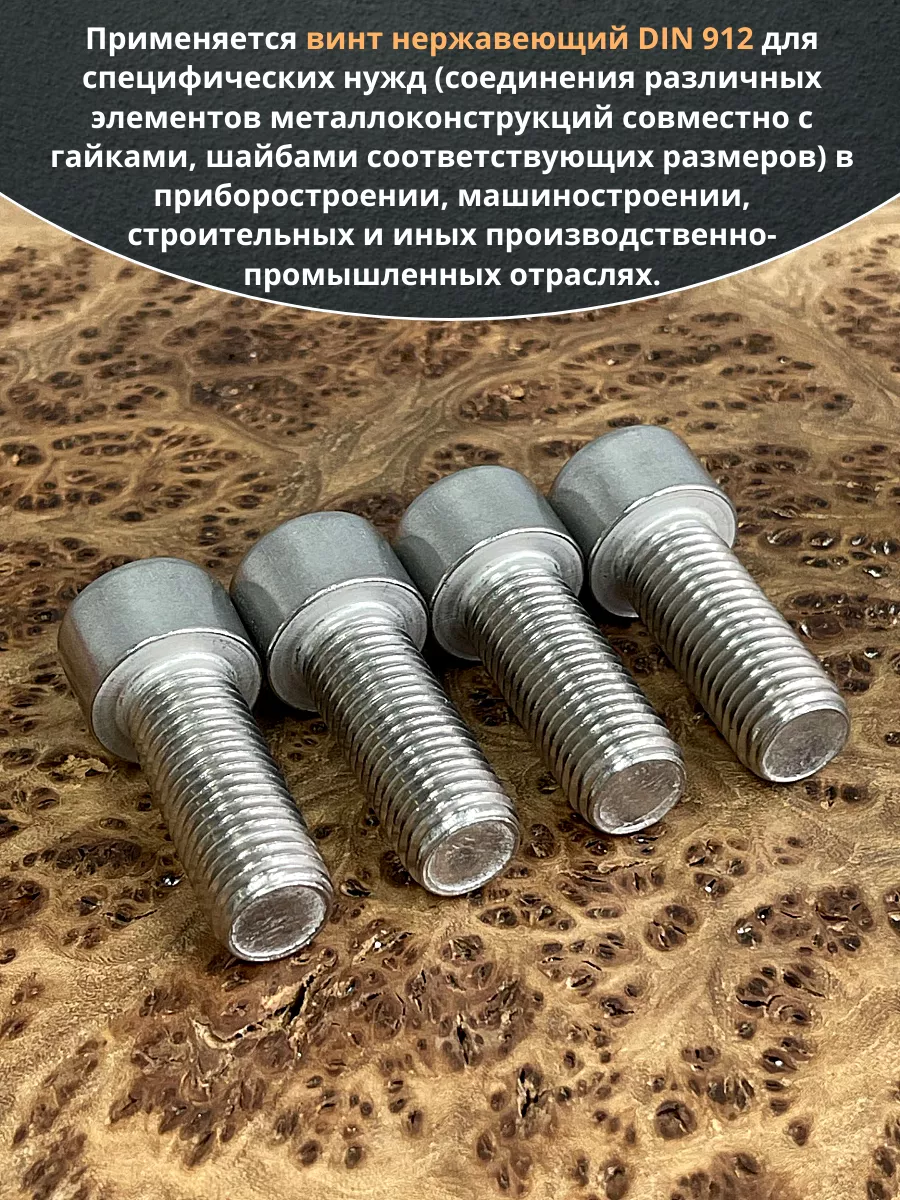 Винт DIN 912 представляет собой металлический стержень с метрической резьбой и головкой цилиндрической формы. Изготовляется из разных материалов, в зависимости от области его применения: сталь 8.8,10.9 или 12,9, сталь с оцинкованным покрытием, нержавеющая сталь А2- А5, латунь, пластик. Прочность на разрыв стали подобного класса достаточно высока, поэтому DIN 912 применяют в конструкциях, которые подвержены серьезным нагрузкам. Применяется винт DIN 912 для специфических нужд (соединения различных элементов металлоконструкций совместно с гайками, шайбами соответствующих размеров) в приборостроении, машиностроении, строительных и иных производственно-промышленных отраслях.