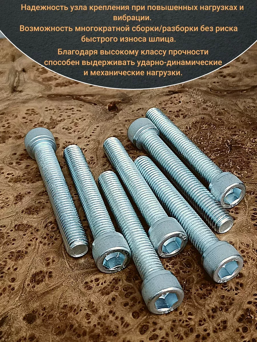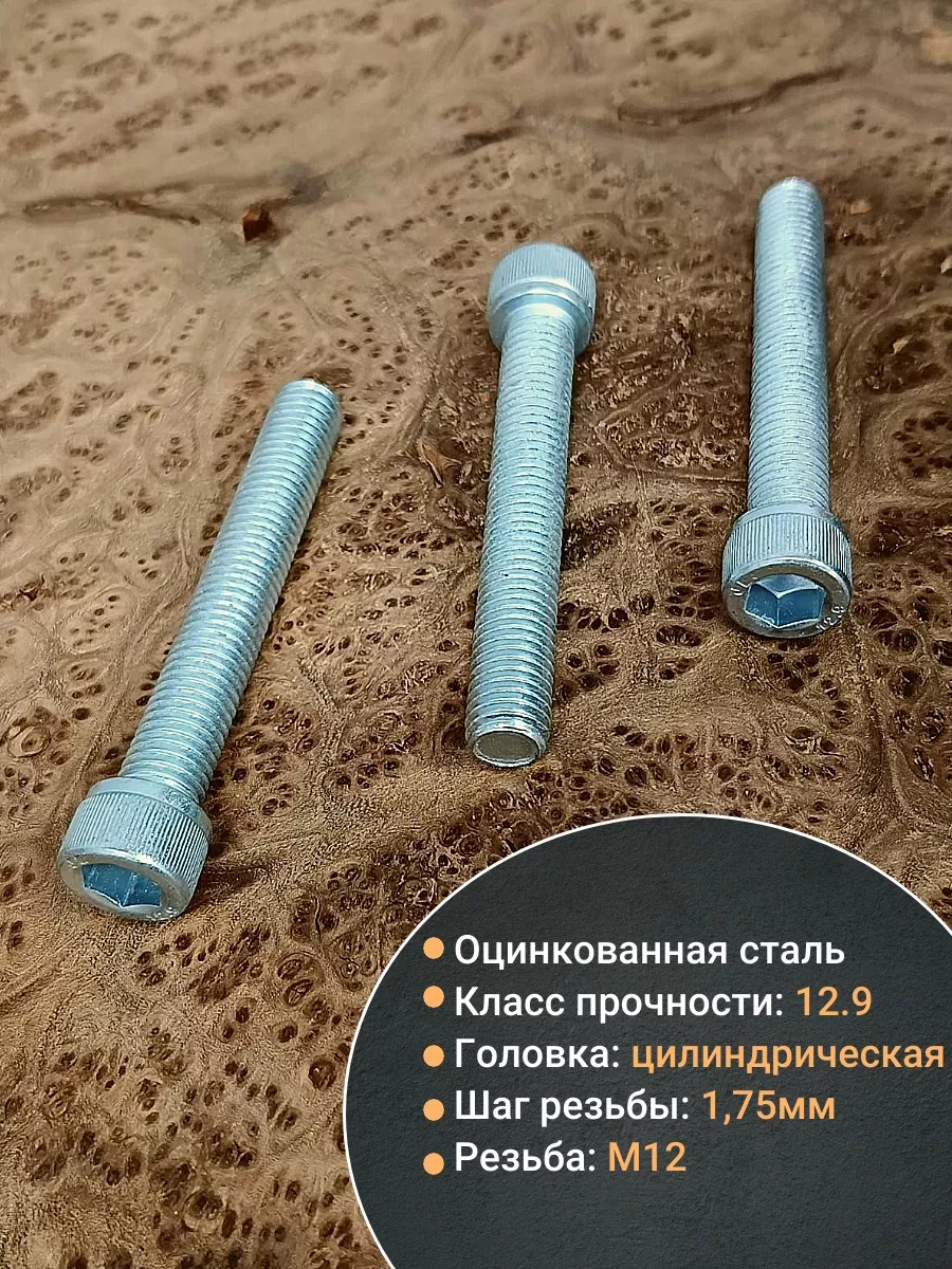 Винт (болт) с внутренним шестигранником (оцинкованный) DIN 912 – высокопрочный метрический крепеж из стали класса прочности 12.9 с цинковым покрытием, без которого не обходятся такие отрасли промышленности как машиностроение, приборостроение, производство станков, промышленного оборудования, дорожной и строительной техники. Механические свойства винта под шестигранник гарантируют надежность узла крепления при повышенных нагрузках и вибрации, возможность приложения высокого момента затяжки при помощи имбусового ключа и возможность многократной сборки/разборки без риска быстрого износа шлица. Гальваническая оцинковка болтов с внутренним шестигранником защищает их от коррозии в нормальных и слабоагрессивных условиях внешней среды. Высокопрочные винты с цилиндрической головкой под ключ-шестигранник выпускаются в классе высокой точности – А, с полем допуска резьбы 6g и в широком диапазоне диаметров и длин. Изделия имеют стержень с полной или неполной резьбой.
