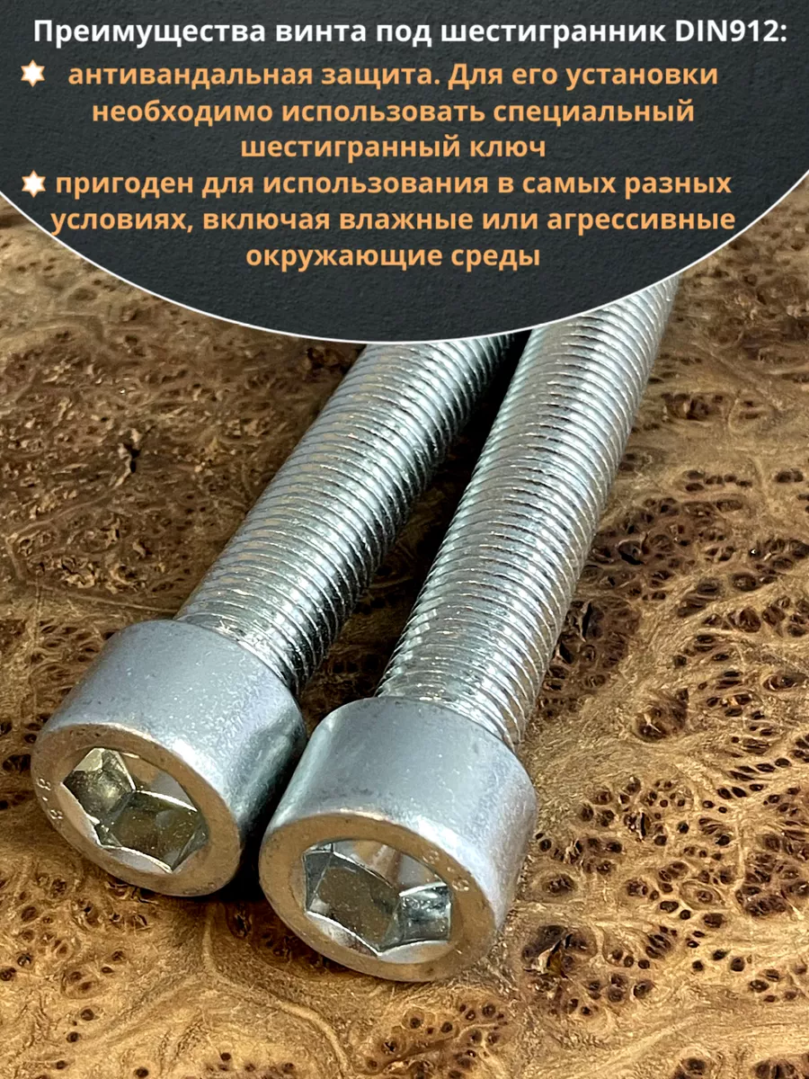 Винт DIN 912 представляет собой металлический стержень с метрической резьбой и головкой цилиндрической формы. Изготовляется из разных материалов, в зависимости от области его применения: сталь 8.8,10.9 или 12,9, сталь с оцинкованным покрытием, нержавеющая сталь А2- А5, латунь, пластик. Прочность на разрыв стали подобного класса достаточно высока, поэтому DIN 912 применяют в конструкциях, которые подвержены серьезным нагрузкам. Применяется винт DIN 912 для специфических нужд (соединения различных элементов металлоконструкций совместно с гайками, шайбами соответствующих размеров) в приборостроении, машиностроении, строительных и иных производственно-промышленных отраслях.