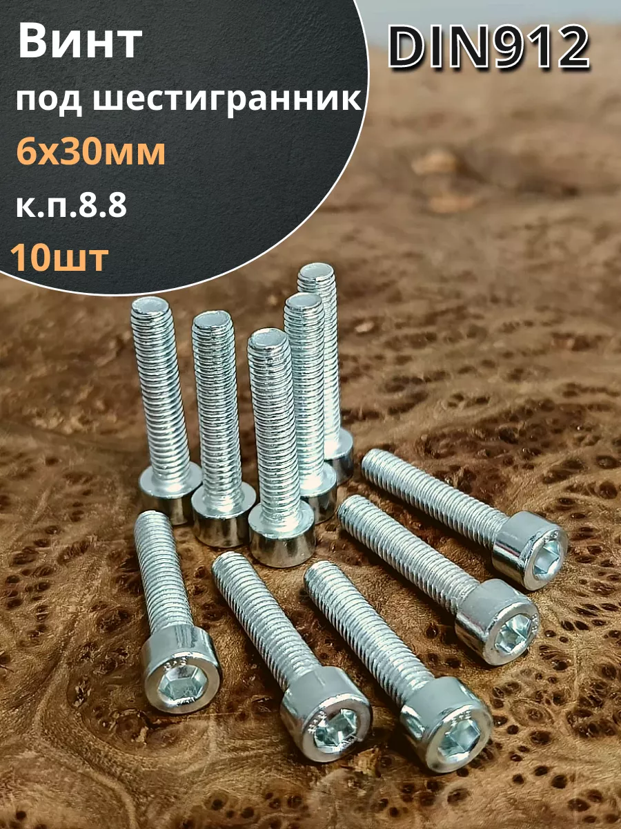 Винт под шестигранник ПР 6х30 мм ОЦ к.п.8.8 DIN912, 10 шт.