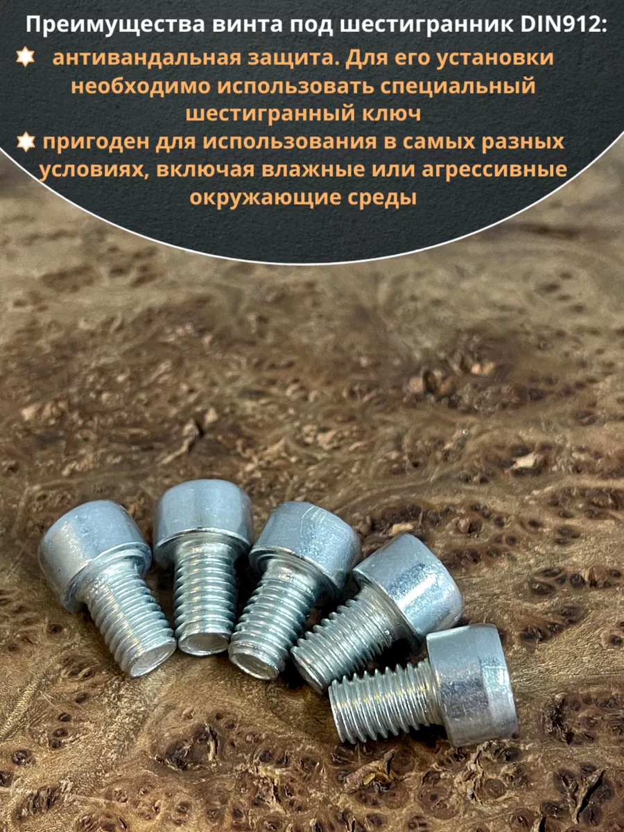 Винт DIN 912 представляет собой металлический стержень с метрической резьбой и головкой цилиндрической формы. Изготовляется из разных материалов, в зависимости от области его применения: сталь 8.8,10.9 или 12,9, сталь с оцинкованным покрытием, нержавеющая сталь А2- А5, латунь, пластик. Прочность на разрыв стали подобного класса достаточно высока, поэтому DIN 912 применяют в конструкциях, которые подвержены серьезным нагрузкам. Применяется винт DIN 912 для специфических нужд (соединения различных элементов металлоконструкций совместно с гайками, шайбами соответствующих размеров) в приборостроении, машиностроении, строительных и иных производственно-промышленных отраслях.