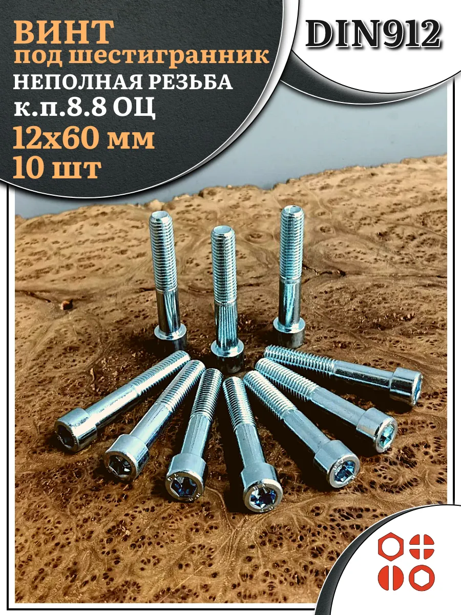 Винт под шестигранник НР 12х60 мм ОЦ к.п.8.8 DIN912, 10 шт.