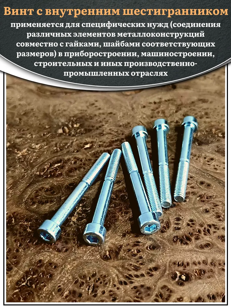 Винт DIN 912 представляет собой металлический стержень с метрической резьбой и головкой цилиндрической формы. Изготовляется из разных материалов, в зависимости от области его применения: сталь 8.8,10.9 или 12,9, сталь с оцинкованным покрытием, нержавеющая сталь А2- А5, латунь, пластик. Прочность на разрыв стали подобного класса достаточно высока, поэтому DIN 912 применяют в конструкциях, которые подвержены серьезным нагрузкам. Применяется винт DIN 912 для специфических нужд (соединения различных элементов металлоконструкций совместно с гайками, шайбами соответствующих размеров) в приборостроении, машиностроении, строительных и иных производственно-промышленных отраслях.