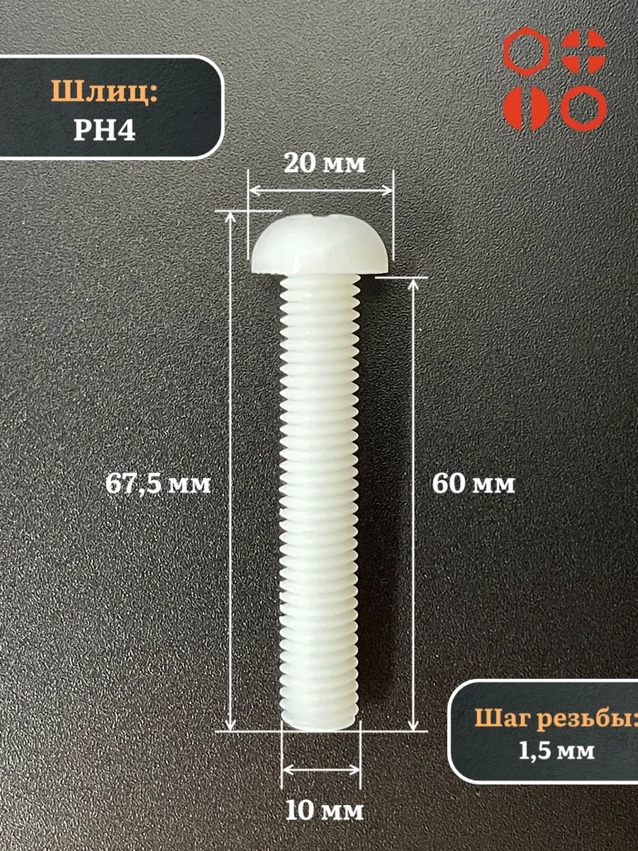 Винт полиамидный 10х60 мм DIN7985 (пластик), 20 шт. вп10607985ф20 1 шт.
