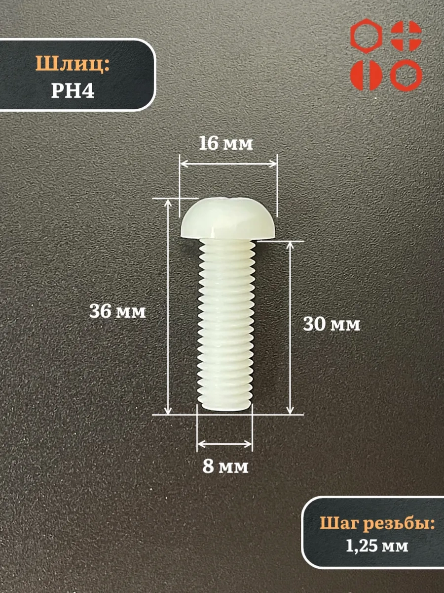 | Винт полиамидный 8х30 мм DIN7985 (пластик), 4 шт. | вп8307985ф4 | 1 шт. |