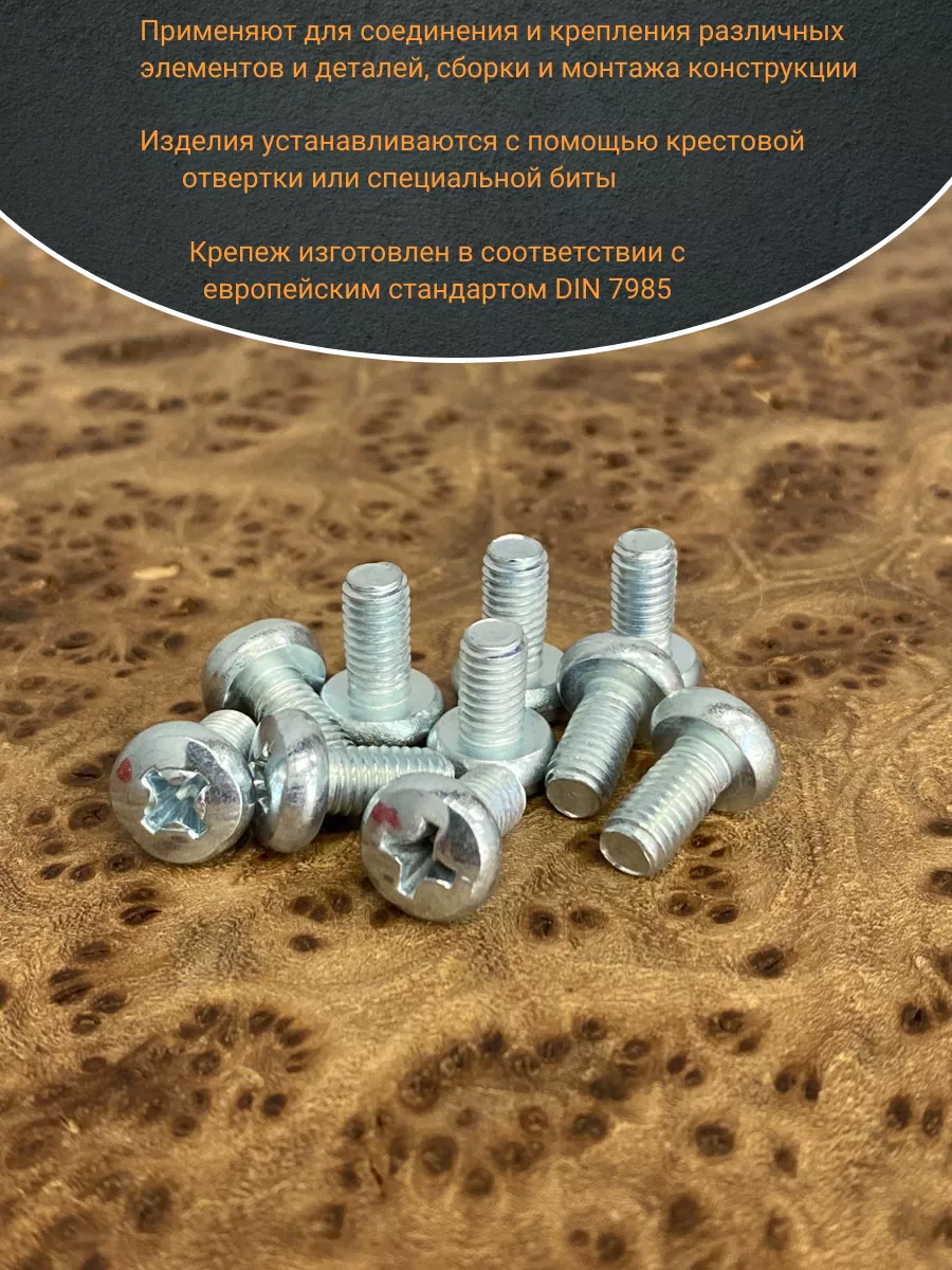 Винт DIN 7985 представляет собой крепежный элемент с полукруглой головкой и шлицем: Philips, Pozi или Torx., подходящим под отвертки и биты. Предназначены для соединения металлических и неметаллических материалов. Винт DIN 7985 используется в производственных, промышленных и строительных областях совместно с шайбами, гайками, втулками и прочими отверстиями с соответствующим размером резьбы, при различных соединениях и креплениях элементов. Производятся из углеродистой стали, нержавеющей стали А2 и А4, латуни, алюминия. Винты, произведенные из углеродистой стали, как правило оцинкованы.