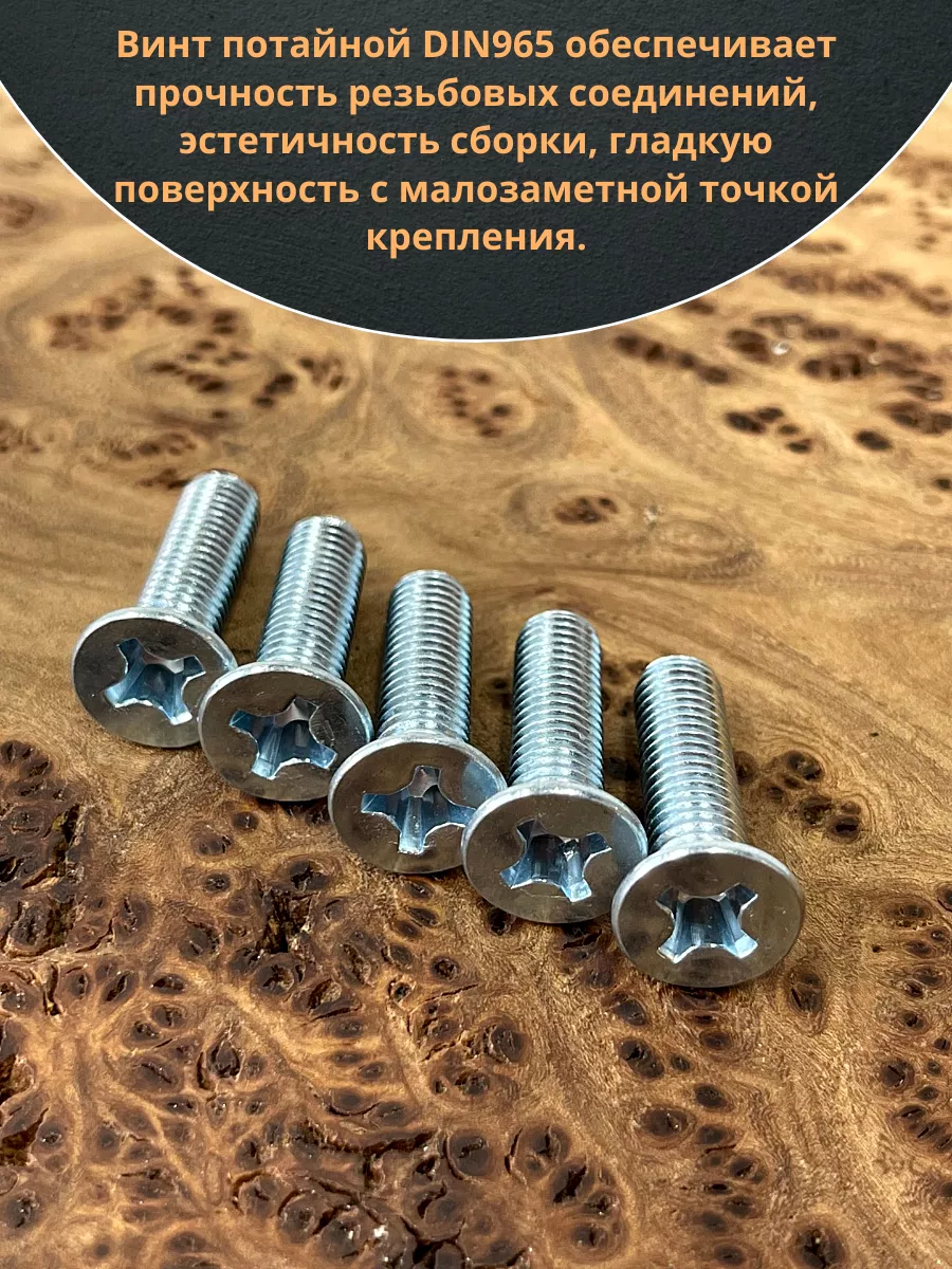 Винт с потайной головкой состоит из головки и стержня с полной резьбой, нарезанной по всей длине шпильки, не имеющего заострения на конце, предназначен для соединения деталей. Монтаж может быть сквозным или глухим. Головка утапливается в материал или конструкцию, не оставаясь на поверхности. Винты DIN 965 используются в строительстве, машиностроении, промышленных и производственных отраслях совместно с шайбами, гайками соответствующих размеров.