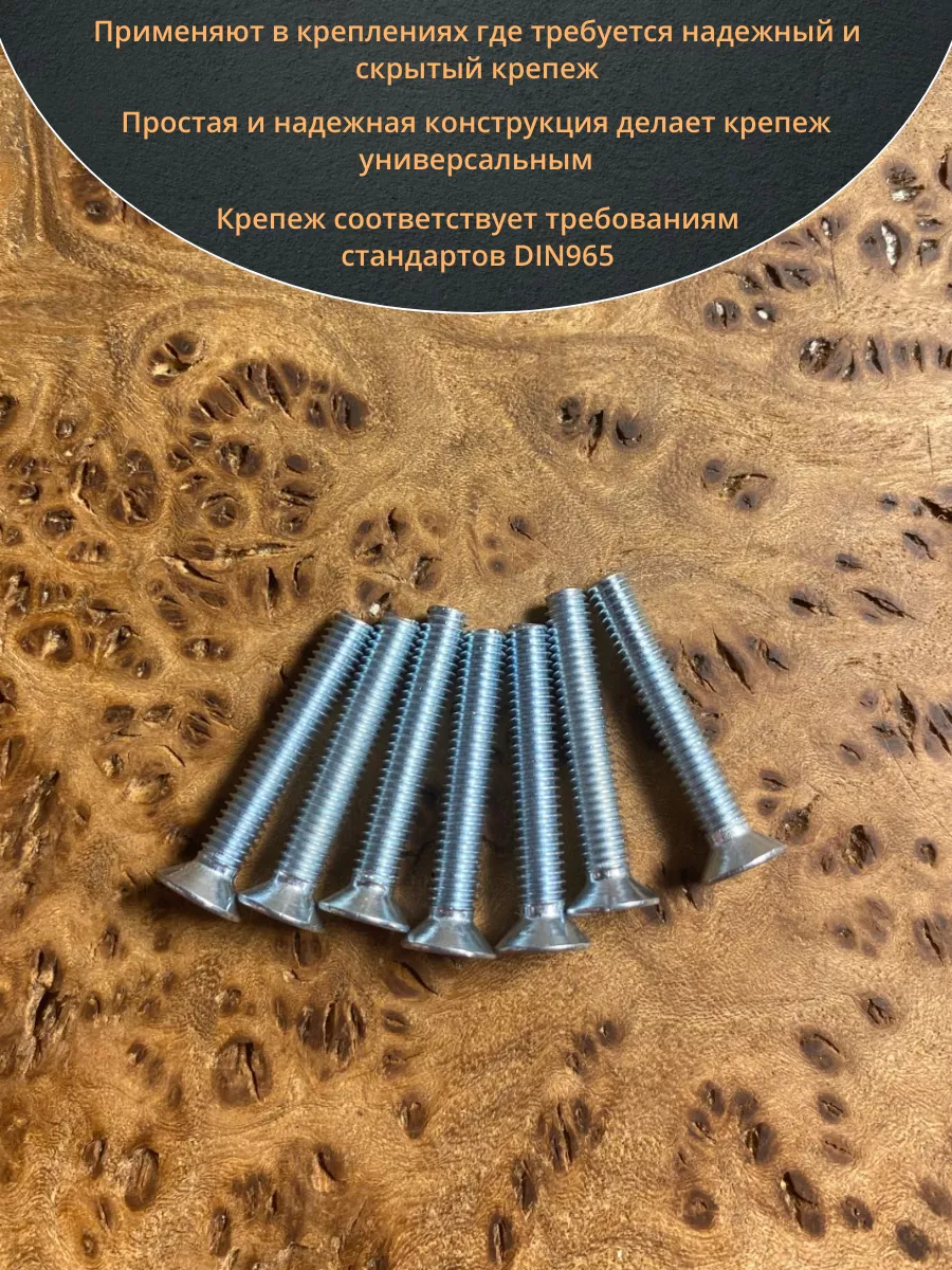 Винт с потайной головкой состоит из головки и стержня с полной резьбой, нарезанной по всей длине шпильки, не имеющего заострения на конце, предназначен для соединения деталей. Монтаж может быть сквозным или глухим. Головка утапливается в материал или конструкцию, не оставаясь на поверхности. Винты DIN 965 используются в строительстве, машиностроении, промышленных и производственных отраслях совместно с шайбами, гайками соответствующих размеров.