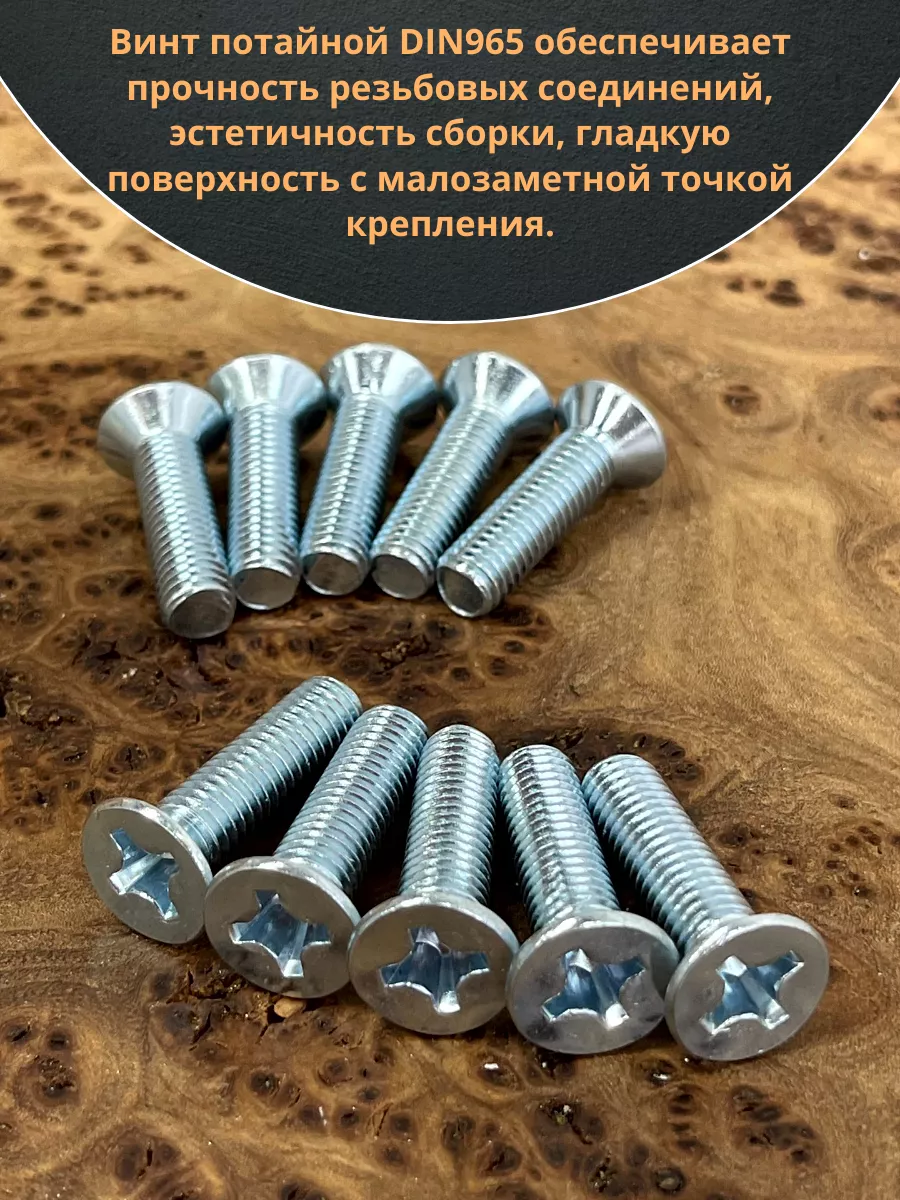 Винт с потайной головкой состоит из головки и стержня с полной резьбой, нарезанной по всей длине шпильки, не имеющего заострения на конце, предназначен для соединения деталей. Монтаж может быть сквозным или глухим. Головка утапливается в материал или конструкцию, не оставаясь на поверхности. Винты DIN 965 используются в строительстве, машиностроении, промышленных и производственных отраслях совместно с шайбами, гайками соответствующих размеров.