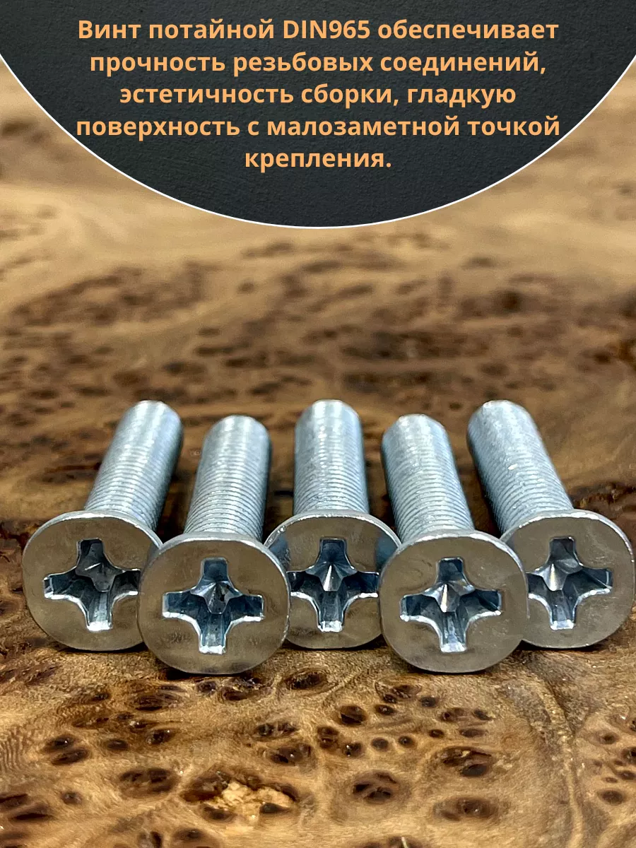 Винт с потайной головкой состоит из головки и стержня с полной резьбой, нарезанной по всей длине шпильки, не имеющего заострения на конце, предназначен для соединения деталей. Монтаж может быть сквозным или глухим. Головка утапливается в материал или конструкцию, не оставаясь на поверхности. Винты DIN 965 используются в строительстве, машиностроении, промышленных и производственных отраслях совместно с шайбами, гайками соответствующих размеров.