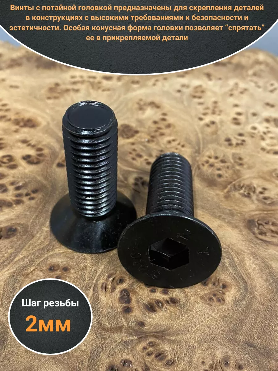 Винты с потайной головкой предназначены для скрепления деталей в конструкциях с высокими требованиями к безопасности и эстетичности. Особая конусная форма головки позволяет “спрятать” ее в прикрепляемой детали. При этом поверхность головки находится в одной плоскости с поверхностью детали. Крепёж с такими свойствами высоко востребован в машино-, автомобилестроении, при сборке бытовой техники, в приборостроении. Конструкция винта DIN 7991 включает стержень с метрической резьбой, потайную головку и шестигранное углубление под ключ для передачи крепежному изделию крутящего момента. Шестигранный внутренний диаметр углубления дает возможность подавать гораздо большее усилие при установке в контакте с ключом или битой. Винты DIN 7991 могут изготавливаться из углеродистых и легированных сталей