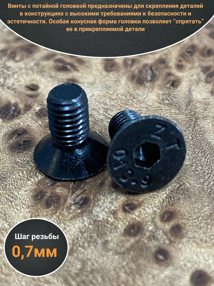 Винты с потайной головкой предназначены для скрепления деталей в конструкциях с высокими требованиями к безопасности и эстетичности. Особая конусная форма головки позволяет “спрятать” ее в прикрепляемой детали. При этом поверхность головки находится в одной плоскости с поверхностью детали. Крепёж с такими свойствами высоко востребован в машино-, автомобилестроении, при сборке бытовой техники, в приборостроении. Конструкция винта DIN 7991 включает стержень с метрической резьбой, потайную головку и шестигранное углубление под ключ для передачи крепежному изделию крутящего момента. Шестигранный внутренний диаметр углубления дает возможность подавать гораздо большее усилие при установке в контакте с ключом или битой. Винты DIN 7991 могут изготавливаться из углеродистых и легированных сталей. Высокопрочный винт М4х10 с потайной головкой и внутренним шестигранником DIN 7991 (ISO 10642) применяется во многих отраслях промышленности и строительства в узлах, испытывающих постоянную нагрузку.