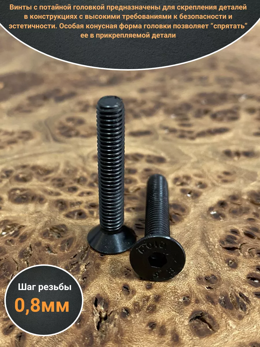 Винты с потайной головкой предназначены для скрепления деталей в конструкциях с высокими требованиями к безопасности и эстетичности. Особая конусная форма головки позволяет “спрятать” ее в прикрепляемой детали. При этом поверхность головки находится в одной плоскости с поверхностью детали. Крепёж с такими свойствами высоко востребован в машино-, автомобилестроении, при сборке бытовой техники, в приборостроении. Конструкция винта DIN 7991 включает стержень с метрической резьбой, потайную головку и шестигранное углубление под ключ для передачи крепежному изделию крутящего момента. Шестигранный внутренний диаметр углубления дает возможность подавать гораздо большее усилие при установке в контакте с ключом или битой. Винты DIN 7991 могут изготавливаться из углеродистых и легированных сталей