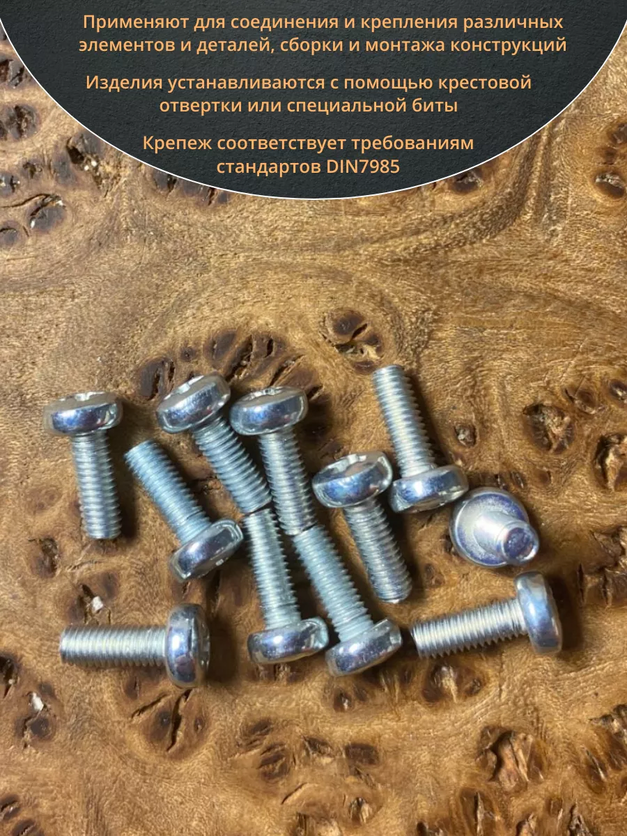 Винт DIN 7985 представляет собой крепежный элемент с полукруглой головкой и шлицем: Philips, Pozi или Torx., подходящим под отвертки и биты. Предназначены для соединения металлических и неметаллических материалов. Винт DIN 7985 используется в производственных, промышленных и строительных областях совместно с шайбами, гайками, втулками и прочими отверстиями с соответствующим размером резьбы, при различных соединениях и креплениях элементов. Производятся из углеродистой стали, нержавеющей стали А2 и А4, латуни, алюминия. Винты, произведенные из углеродистой стали, как правило оцинкованы.