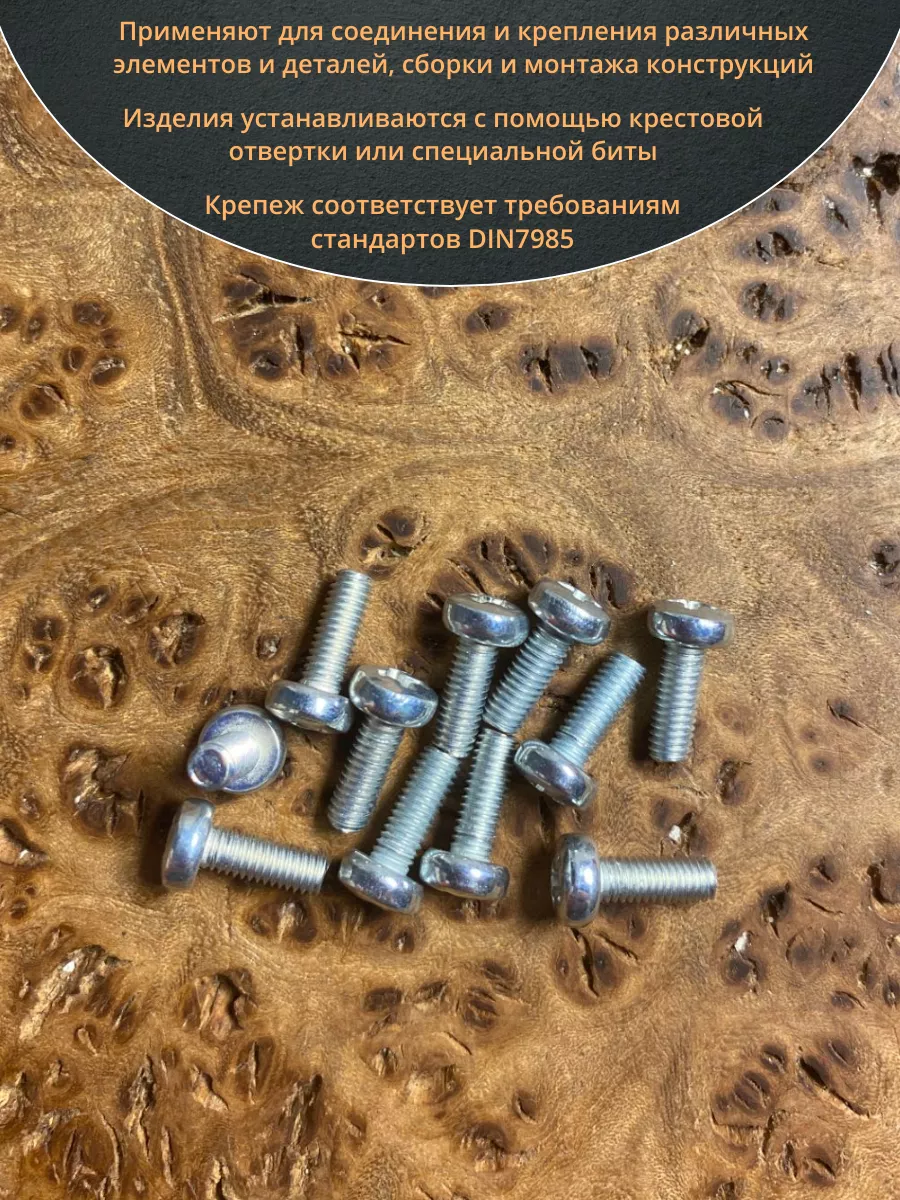 Винт DIN 7985 представляет собой крепежный элемент с полукруглой головкой и шлицем: Philips, Pozi или Torx., подходящим под отвертки и биты. Предназначены для соединения металлических и неметаллических материалов. Винт DIN 7985 используется в производственных, промышленных и строительных областях совместно с шайбами, гайками, втулками и прочими отверстиями с соответствующим размером резьбы, при различных соединениях и креплениях элементов. Производятся из углеродистой стали, нержавеющей стали А2 и А4, латуни, алюминия. Винты, произведенные из углеродистой стали, как правило оцинкованы.