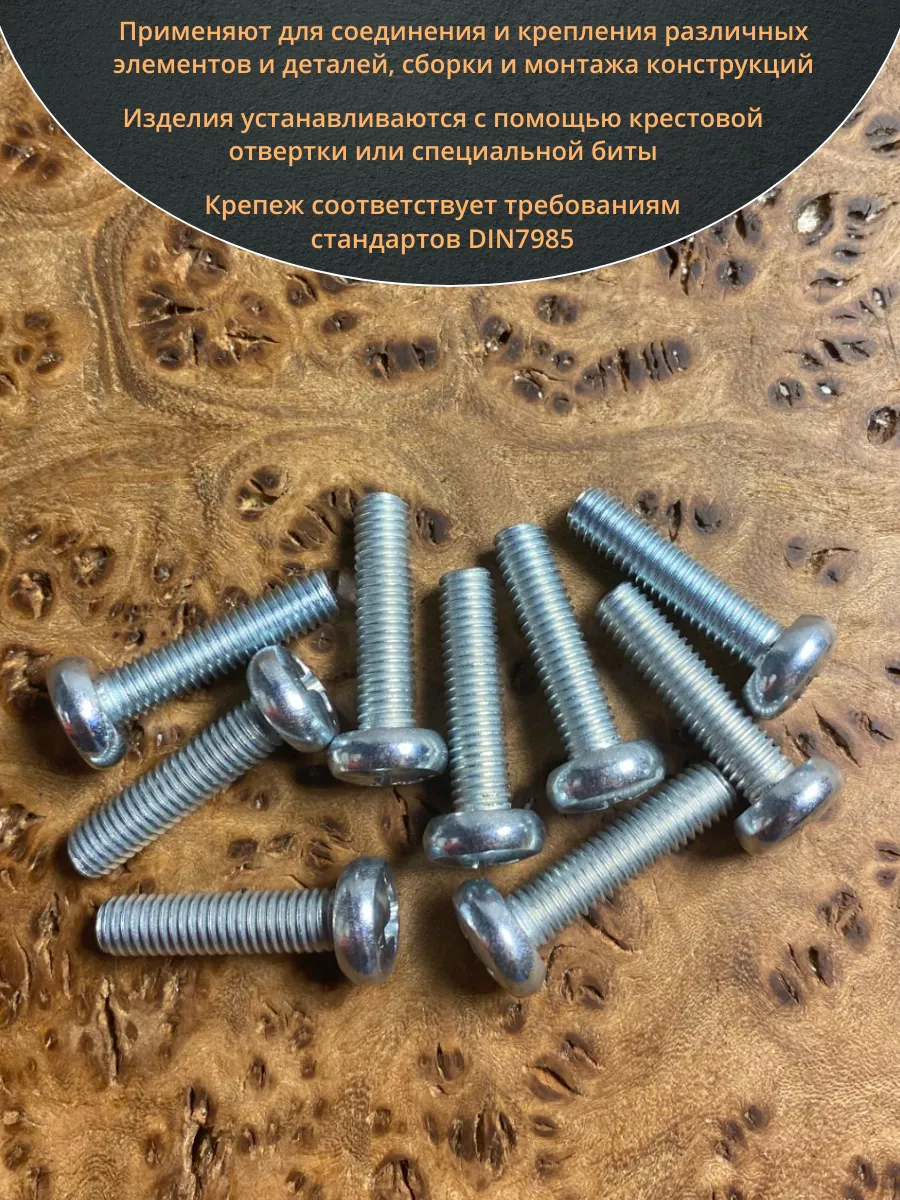 Винт DIN 7985 представляет собой крепежный элемент с полукруглой головкой и шлицем: Philips, Pozi или Torx., подходящим под отвертки и биты. Предназначены для соединения металлических и неметаллических материалов. Винт DIN 7985 используется в производственных, промышленных и строительных областях совместно с шайбами, гайками, втулками и прочими отверстиями с соответствующим размером резьбы, при различных соединениях и креплениях элементов. Производятся из углеродистой стали, нержавеющей стали А2 и А4, латуни, алюминия. Винты, произведенные из углеродистой стали, как правило оцинкованы.