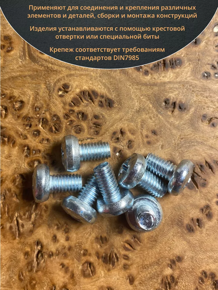 Винт DIN 7985 представляет собой крепежный элемент с полукруглой головкой и шлицем: Philips, Pozi или Torx., подходящим под отвертки и биты. Предназначены для соединения металлических и неметаллических материалов. Винт DIN 7985 используется в производственных, промышленных и строительных областях совместно с шайбами, гайками, втулками и прочими отверстиями с соответствующим размером резьбы, при различных соединениях и креплениях элементов. Производятся из углеродистой стали, нержавеющей стали А2 и А4, латуни, алюминия. Винты, произведенные из углеродистой стали, как правило оцинкованы.