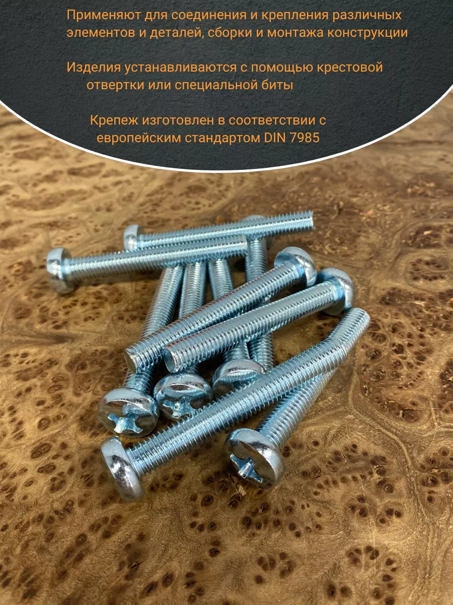 Винт DIN 7985 представляет собой крепежный элемент с полукруглой головкой и шлицем: Philips, Pozi или Torx., подходящим под отвертки и биты. Предназначены для соединения металлических и неметаллических материалов. Винт DIN 7985 используется в производственных, промышленных и строительных областях совместно с шайбами, гайками, втулками и прочими отверстиями с соответствующим размером резьбы, при различных соединениях и креплениях элементов. Производятся из углеродистой стали, нержавеющей стали А2 и А4, латуни, алюминия. Винты, произведенные из углеродистой стали, как правило оцинкованы.