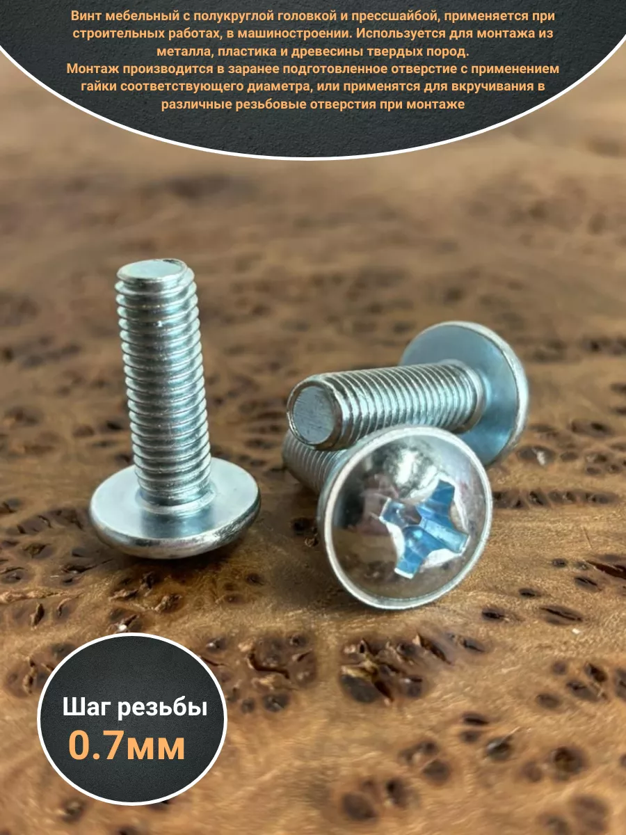 Винт мебельный с полукруглой головкой и прессшайбой, применяется при строительных работах, в машиностроении. Используется для монтажа из металла, пластика и древесины твердых пород. Монтаж производится в заранее подготовленное отверстие с применением гайки соответствующего диаметра, или применятся для вкручивания в различные резьбовые отверстия при монтаже.