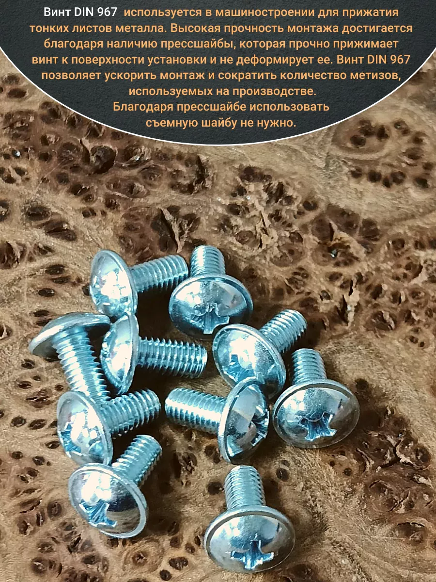 Винт мебельный с полукруглой головкой и прессшайбой, применяется при строительных работах, в машиностроении. Используется для монтажа из металла, пластика и древесины твердых пород. Монтаж производится в заранее подготовленное отверстие с применением гайки соответствующего диаметра, или применятся для вкручивания в различные резьбовые отверстия при монтаже. Винт мебельный DIN 967 — это универсальное крепежное изделие в виде стержня с наружной резьбой, выполненной по всей длинне. Головка крепежа в виде полусферы с широкими полями, на головке имеются пазы под крестовую отвертку. При проведении монтажа можно использовать как PZ, так и SL отвертки или насадки, что делает крепеж универсальным.