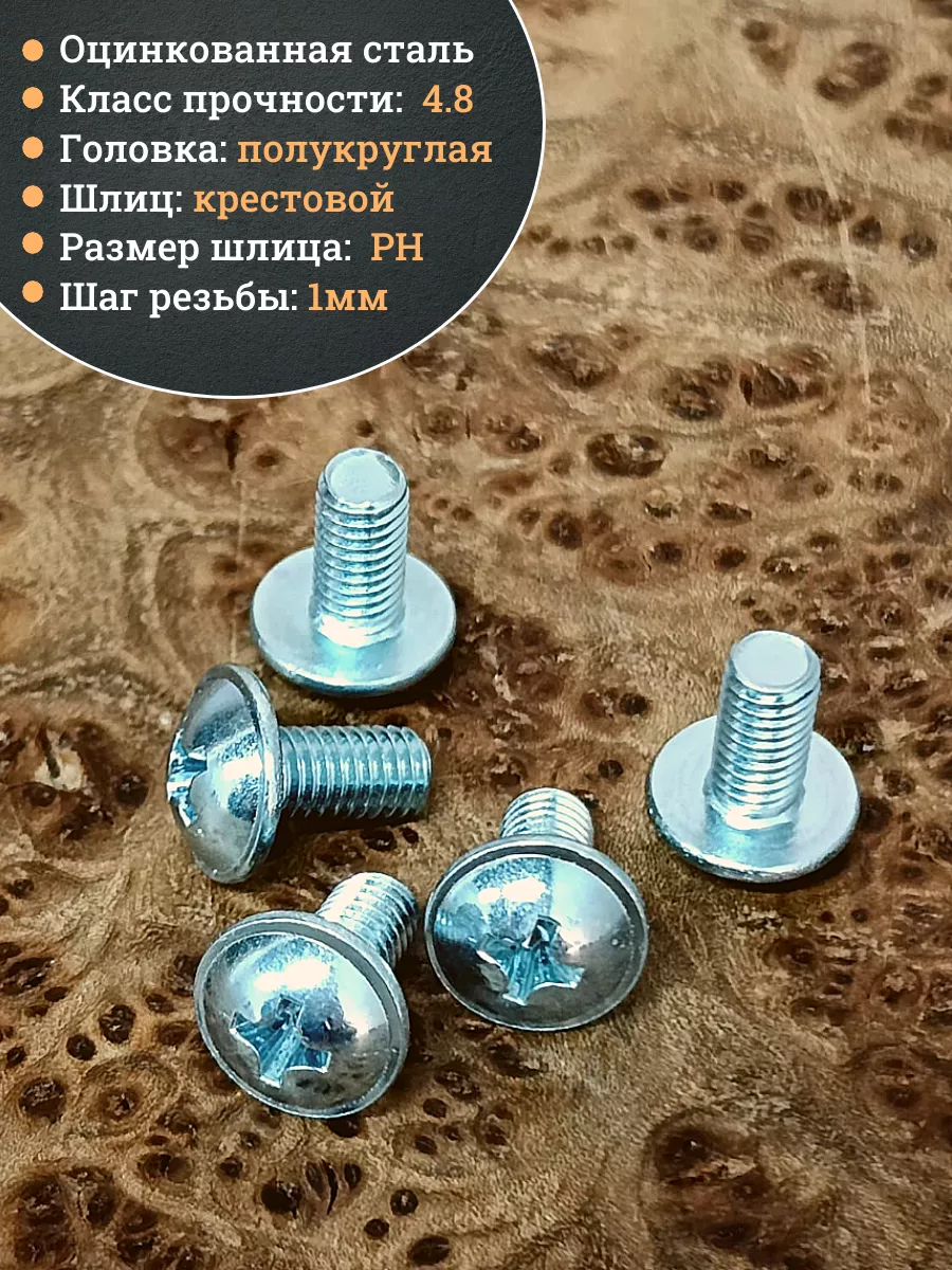 Винт мебельный с полукруглой головкой и прессшайбой, применяется при строительных работах, в машиностроении. Используется для монтажа из металла, пластика и древесины твердых пород. Монтаж производится в заранее подготовленное отверстие с применением гайки соответствующего диаметра, или применятся для вкручивания в различные резьбовые отверстия при монтаже.