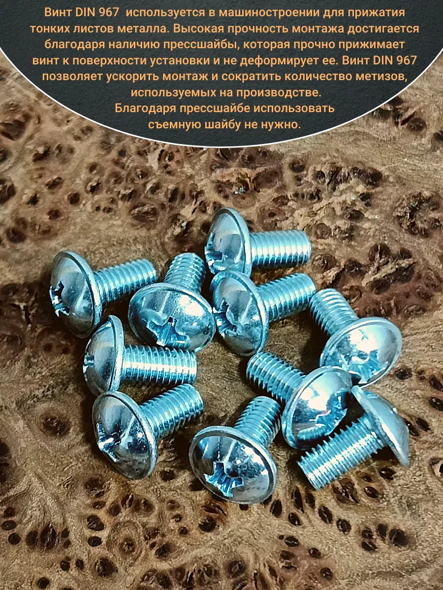Винт мебельный с полукруглой головкой и прессшайбой, применяется при строительных работах, в машиностроении. Используется для монтажа из металла, пластика и древесины твердых пород. Монтаж производится в заранее подготовленное отверстие с применением гайки соответствующего диаметра, или применятся для вкручивания в различные резьбовые отверстия при монтаже. Винт мебельный DIN 967 — это универсальное крепежное изделие в виде стержня с наружной резьбой, выполненной по всей длинне. Головка крепежа в виде полусферы с широкими полями, на головке имеются пазы под крестовую отвертку. При проведении монтажа можно использовать как PZ, так и SL отвертки или насадки, что делает крепеж универсальным.