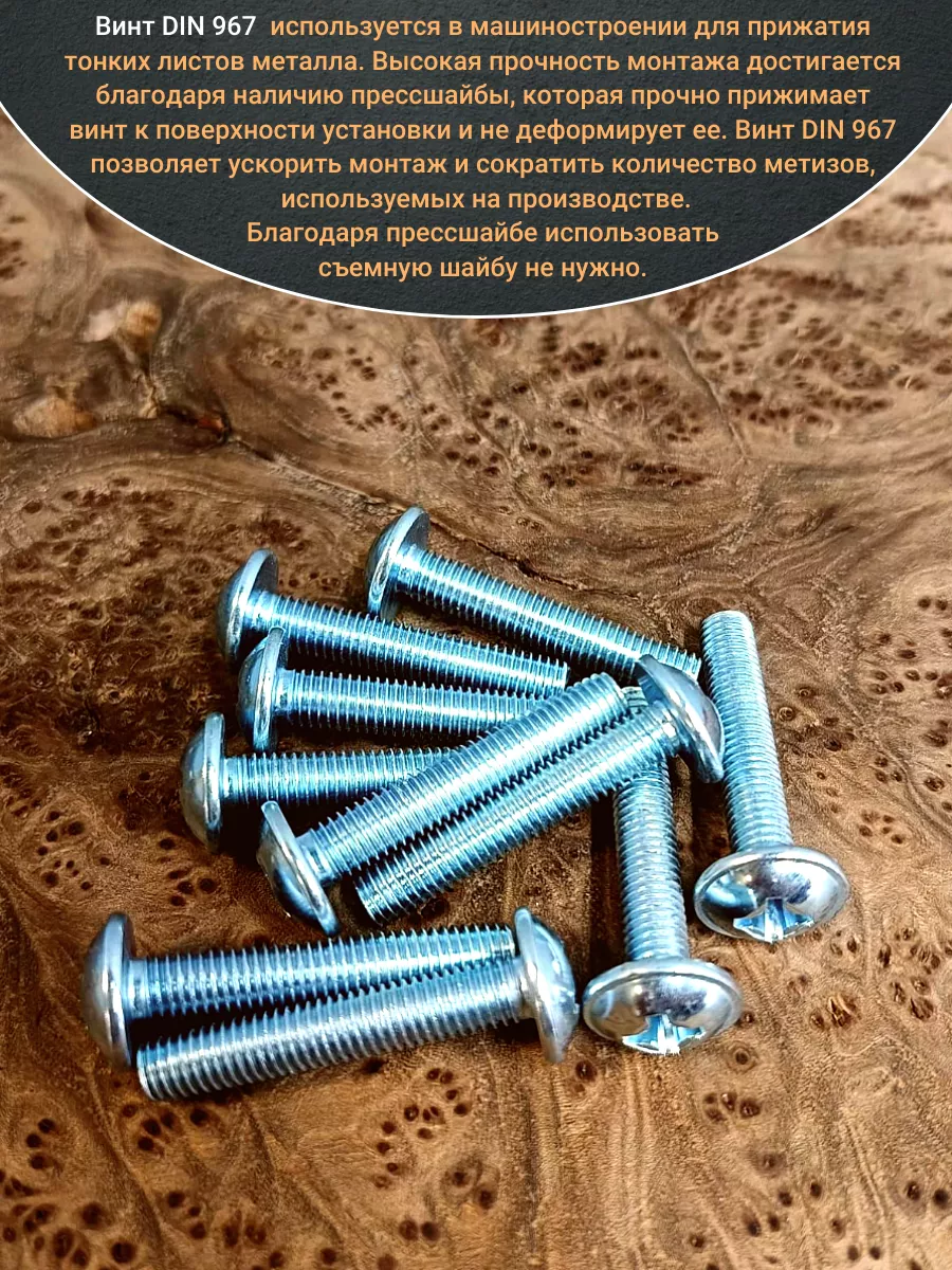 Винт мебельный DIN 967 — это универсальное крепежное изделие в виде стержня с наружной резьбой, выполненной по всей длиннее. Головка крепежа в виде полусферы с широкими полями, на головки имеются пазы под крестовую отвертку. При проведении монтажа можно использовать как PZ, так и SL отвертки или насадки, что делает крепеж универсальным.