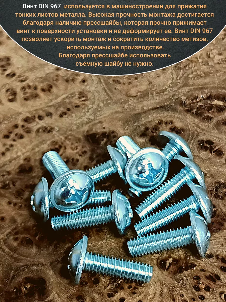 Винт мебельный DIN 967 — это универсальное крепежное изделие в виде стержня с наружной резьбой, выполненной по всей длиннее. Головка крепежа в виде полусферы с широкими полями, на головки имеются пазы под крестовую отвертку. При проведении монтажа можно использовать как PZ, так и SL отвертки или насадки, что делает крепеж универсальным.