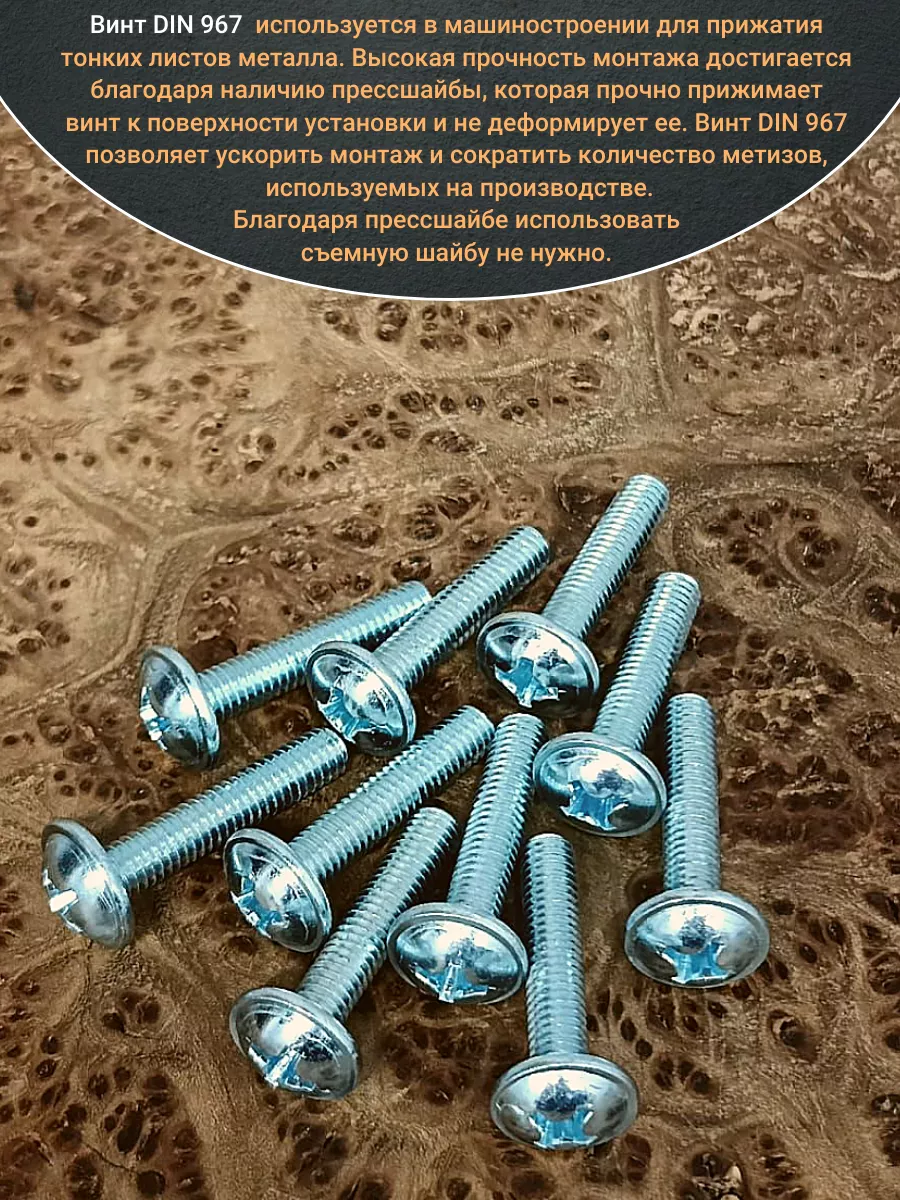Винт мебельный DIN 967 — это универсальное крепежное изделие в виде стержня с наружной резьбой, выполненной по всей длиннее. Головка крепежа в виде полусферы с широкими полями, на головки имеются пазы под крестовую отвертку. При проведении монтажа можно использовать как PZ, так и SL отвертки или насадки, что делает крепеж универсальным.