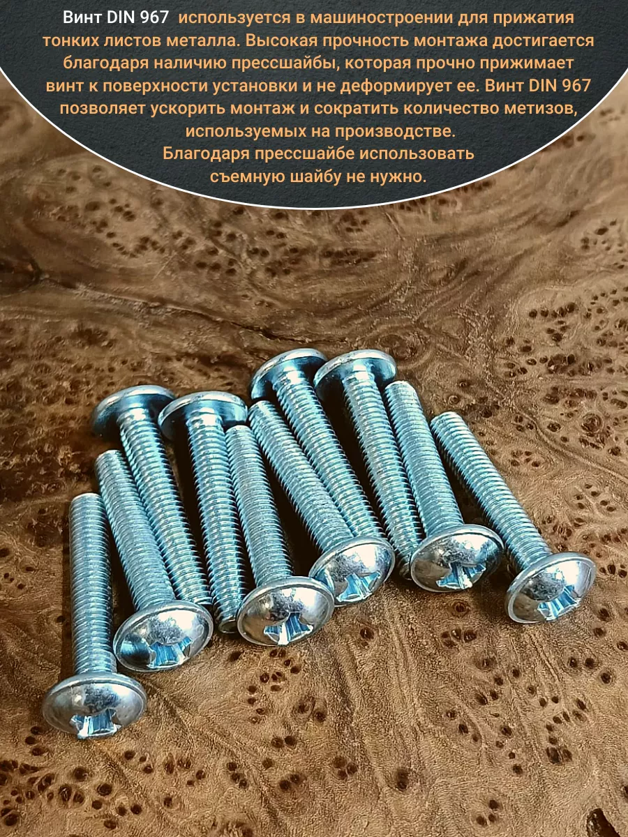 Винт мебельный DIN 967 — это универсальное крепежное изделие в виде стержня с наружной резьбой, выполненной по всей длиннее. Головка крепежа в виде полусферы с широкими полями, на головки имеются пазы под крестовую отвертку. При проведении монтажа можно использовать как PZ, так и SL отвертки или насадки, что делает крепеж универсальным.