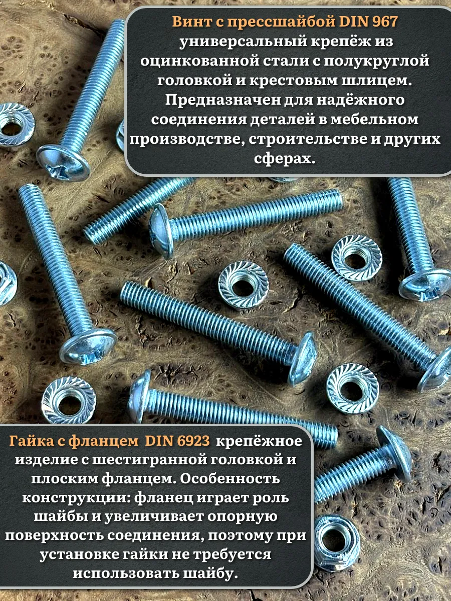 Винт мебельный с полукруглой головкой и прессшайбой, применяется при строительных работах, в машиностроении. Используется для монтажа из металла, пластика и древесины твердых пород. Монтаж производится в заранее подготовленное отверстие с применением гайки соответствующего диаметра, или применятся для вкручивания в различные резьбовые отверстия при монтаже.