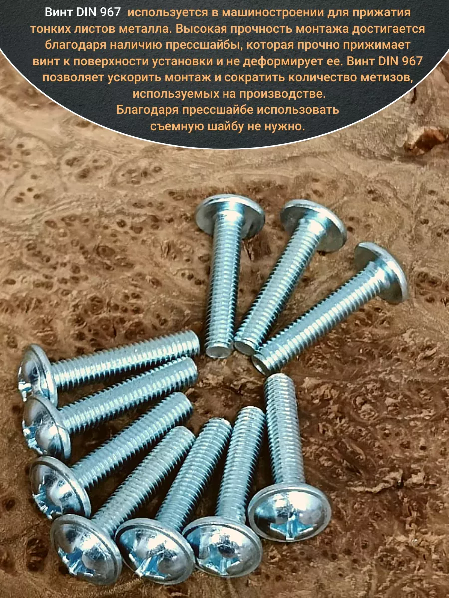 Винт мебельный с полукруглой головкой и прессшайбой, применяется при строительных работах, в машиностроении. Используется для монтажа из металла, пластика и древесины твердых пород. Монтаж производится в заранее подготовленное отверстие с применением гайки соответствующего диаметра, или применятся для вкручивания в различные резьбовые отверстия при монтаже. Винт мебельный DIN 967 — это универсальное крепежное изделие в виде стержня с наружной резьбой, выполненной по всей длинне. Головка крепежа в виде полусферы с широкими полями, на головке имеются пазы под крестовую отвертку. При проведении монтажа можно использовать как PZ, так и SL отвертки или насадки, что делает крепеж универсальным.