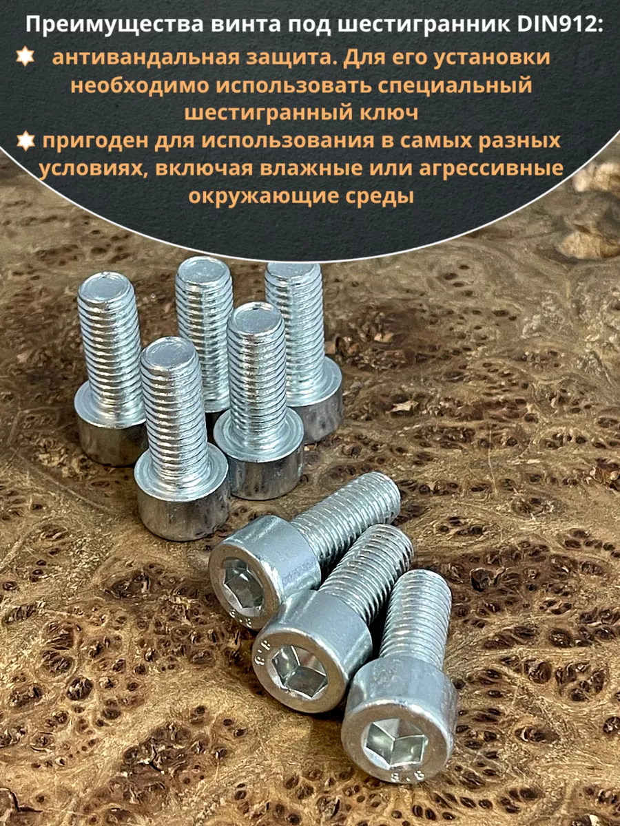 Винт DIN 912 представляет собой металлический стержень с метрической резьбой и головкой цилиндрической формы. Изготовляется из разных материалов, в зависимости от области его применения: сталь 8.8,10.9 или 12,9, сталь с оцинкованным покрытием, нержавеющая сталь А2- А5, латунь, пластик. Прочность на разрыв стали подобного класса достаточно высока, поэтому DIN 912 применяют в конструкциях, которые подвержены серьезным нагрузкам. Применяется винт DIN 912 для специфических нужд (соединения различных элементов металлоконструкций совместно с гайками, шайбами соответствующих размеров) в приборостроении, машиностроении, строительных и иных производственно-промышленных отраслях.