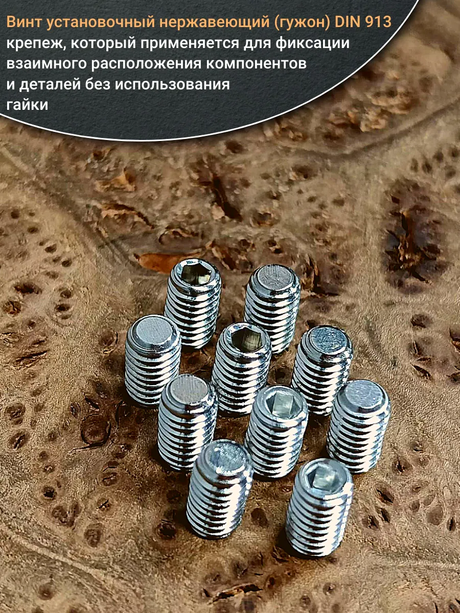 Винт DIN 913 - винт установочный с полной метрической резьбой, с внутренним шестигранником под ключ. Конец установочного винта имеет специальную форму, служащую для фиксации изделий относительно друг друга. Винт DIN 913 используется для соединения элементов конструкций в машиностроении, приборостроении и прочих промышленно-производственных отраслях для фиксации деталей и элементов машин и устройств (где нет возможности применить болт с головкой) совместно с гайками, шайбами соответствующих размеров. В качестве материала для установочных винтов используют высокопрочные сорта стали с твердостью не ниже 45H, нержавеющую стать А1, А2, А4, иногда полиамид. Стальные болты могут быть покрыты цинком для улучшения их эксплуатационных характеристик.