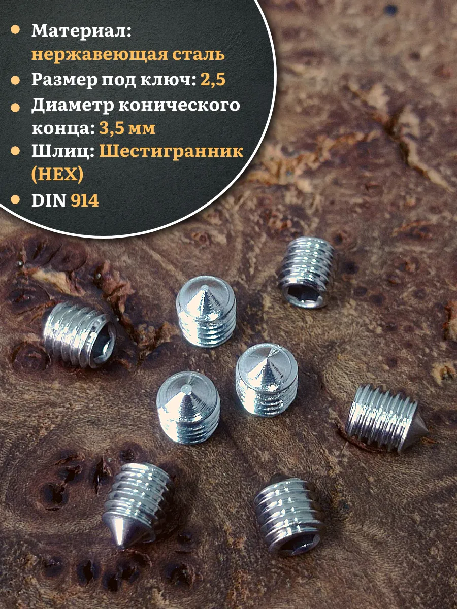 DIN 914 - винт установочный с полной метрической резьбой, с острым концом используется для соединения элементов конструкций в машиностроении, приборостроении и прочих промышленно-производственных отраслях совместно с гайками, шайбами соответствующих размеров. Производится из углеродистой стали, нержавеющей стали А2 и А4, латуни. Его можно отличить по отсутствию головки, где шлиц (углубление под плоскую отвертку или шестигранник) находится непосредственно в торце. Корпус крепежа полностью выполнен в виде резьбы и, проходя через гнездо в детали, упирается в него на всю свою длину, что повышает надежность сцепления. Нажимной кончик также бывает различной формы, может быть выполнен из разных материалов (например, нейлона) и предназначен для повышения устойчивости фиксации.