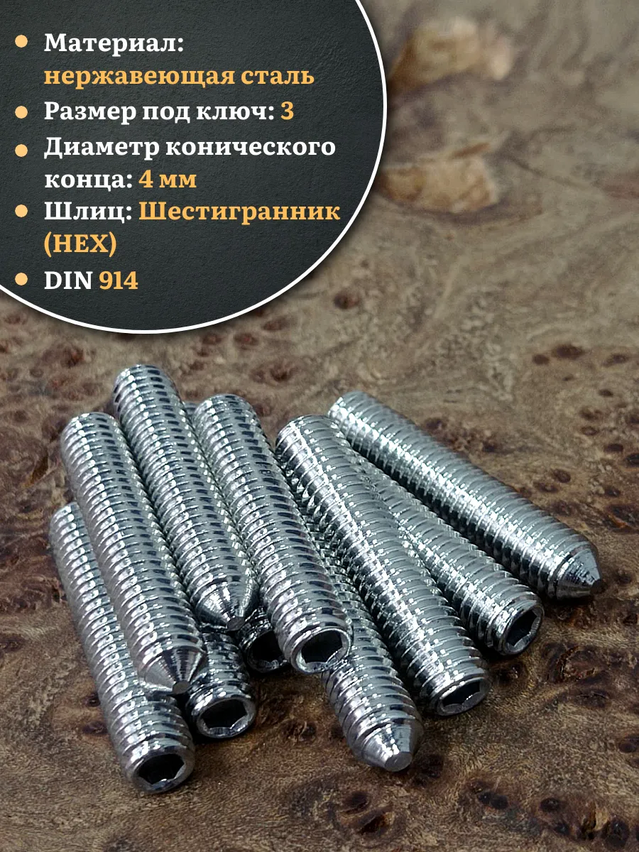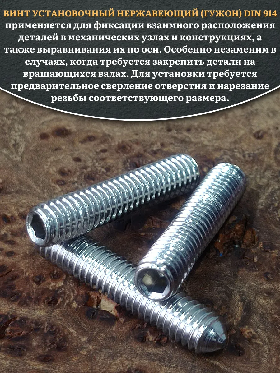 DIN 914 - винт установочный с полной метрической резьбой, с острым концом используется для соединения элементов конструкций в машиностроении, приборостроении и прочих промышленно-производственных отраслях совместно с гайками, шайбами соответствующих размеров. Производится из углеродистой стали, нержавеющей стали А2 и А4, латуни. Его можно отличить по отсутствию головки, где шлиц (углубление под плоскую отвертку или шестигранник) находится непосредственно в торце. Корпус крепежа полностью выполнен в виде резьбы и, проходя через гнездо в детали, упирается в него на всю свою длину, что повышает надежность сцепления. Нажимной кончик также бывает различной формы, может быть выполнен из разных материалов (например, нейлона) и предназначен для повышения устойчивости фиксации.