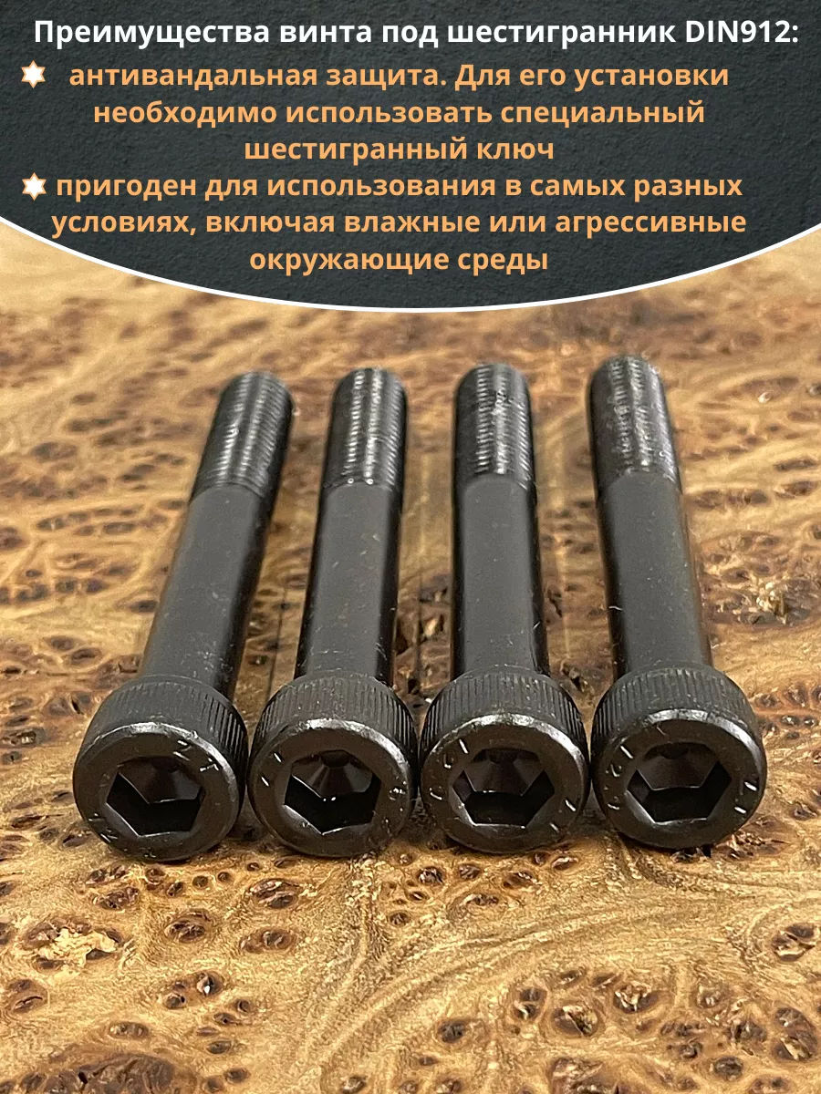 Винт имеет высокую цилиндрическую головку, предназначен для установки его с углублением в отверстие. Закручивается винт при помощи ключа-шестигранника. Высокопрочный винт DIN 912 обеспечивает надежное скрепление узлов и деталей в монтажных и других видах работ. Он имеет головку цилиндрической формы с углублением под соответствующий шестигранный ключ.
